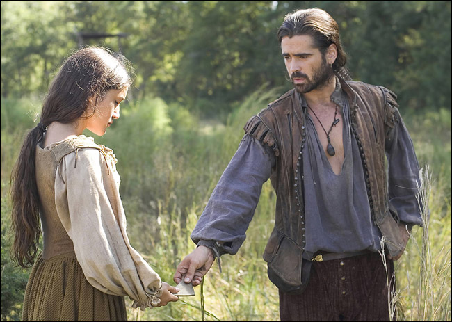 Columbus was searching for a shorter trading route to the east himself when he landed on these shores, mistakenly believing he had arrived in the Indies, his accidental ‘discovery’ of America becoming his lasting claim to fame. Intrepid explorer Smith similarly stumbled across, by pure chance, something far finer than what he’d actually been in quest of, something he’d been unconsciously on the lookout for all his aimless life long – utopia. His search was over, a regretful fact he only realizes once he’s foolishly let it slip through his fingers, once he’s “sailed past” his metaphorical Indies. Though he has yet to master that damnably disconcerting Irish brogue (his Canadian leading lady, of Native American and Swiss heritage, speaks the Queen’s English more clearly than he does), Colin Farrell, with his role here and in last year’s Alexander, seems dead set on positioning himself as the American cinema’s premiere master of the universe – a one-man world conqueror. But before the I.R.A. revokes his passport, it should be pointed out that he’s working a shrewdly political subtext into these period pieces promoting one-world cultural colonization. Here, he seems to derive undue delight from depicting The New World’s English protagonist as something less than a paragon of virtue. His disreputable John Smith is far from the wholesome, flaxen-haired demi-god Mel Gibson made of him in the Disney cartoon. With his olive complexion and long, coal black hair, he could almost pass for an Indian himself, one of the subjugated, so it’s not surprising his Smith displays such fellow feeling for them. The bad boy off screen image Farrell’s been carefully cultivating over the past several years never stood him in better stead than it does here (he’s got that smoldering glower down to a science). This John Smith is not the national hero school textbooks write about. “You have the makings of a leader,” Newport observes of him, “but can you be relied on?” The answer, as Pocahontas comes to discover, is a resounding no.