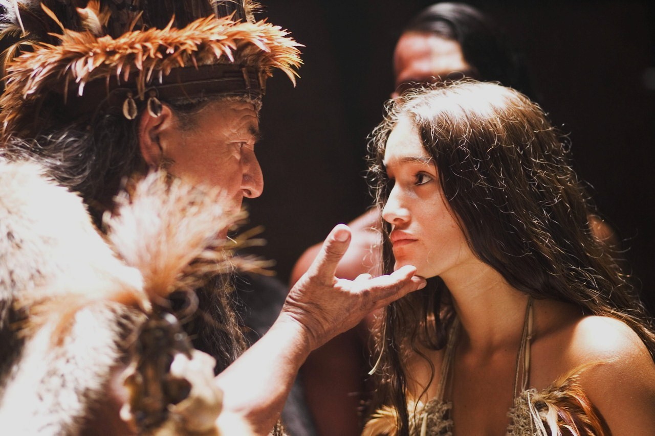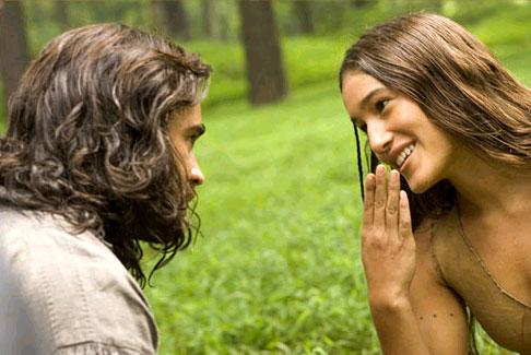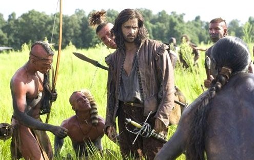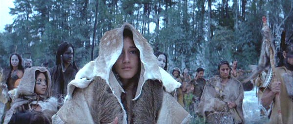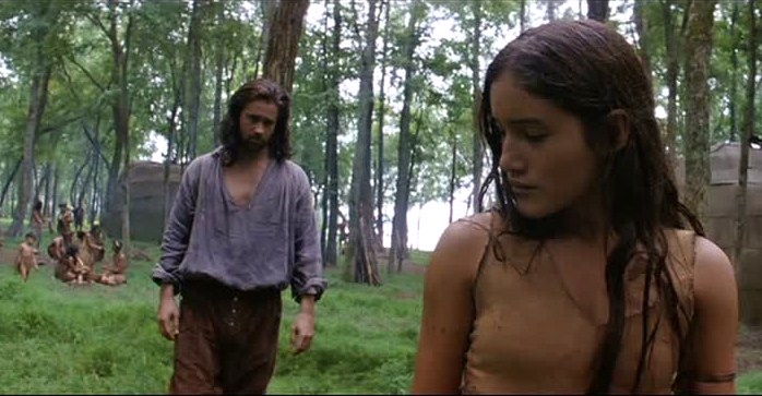 Malick starts out seeing the natives through ethnocentric European eyes, as innocent and childlike, the way the settlers saw them upon their superficial first contact. Later, when they lose the favor of these same ‘naturals,’ they come across as savage, brutal, bloodthirsty, club wielding cannibals. When Smith is brought before Chief Powhatan’s tribal council, the painted, animal clad Indians, with their whooping war cries and exotic ceremonial dress seem as demoniac and other worldly as the Skull Island natives of Peter Jackson’s King Kong earlier this year. These are the Algonquians as the frightened, racist Christian settlers saw them, “Sons of sulfur, devils from the mouth of hell.” Yet as the captive comes to learn more about their culture during his tenure among them, and his respect for their way of life grows, his opinion swings to the other extreme entirely. “They are gentle, loving, faithful, lacking in all guile and trickery,” Smith soliloquizes, and Malick’s conception of the natives as savage “innocents,” uncorrupted by the sins of the civilized world, is as naïve as his depiction of the Pacific Islanders was in The Thin Red Line. It’s patronizing and condescending, the attitude of a paternal, great white father. They seem to exist for the sole purpose of being disillusioned. No one can live both in the world and apart from it. No man is an island. Original sin taints one and all. The director doesn’t see the Algonquians as real people so much as unattainable ideals, and despite the flattering, nigh reverential representation, that remains an ethnocentric take on indigenous culture. To make the Algonquians seem preternaturally good is, in a sense, to dehumanize them, depriving them of fully rounded, human scope, as surely as old westerns did by making Native Americans seem preternaturally evil. It oversimplifies matters.