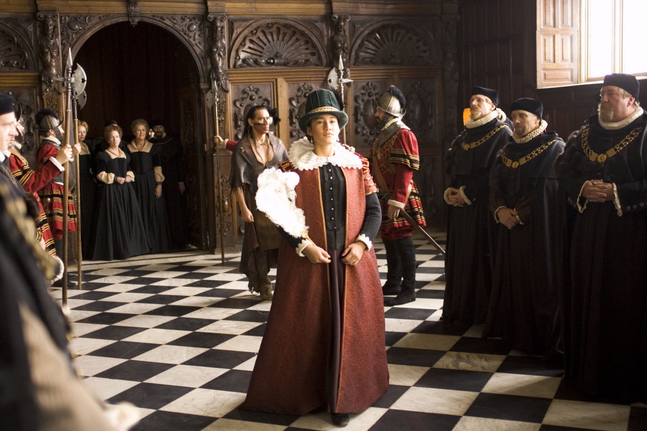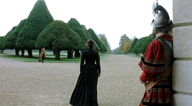 Pocahontas’ journey to the Old World, where she is to be presented to the king like visiting royalty, much as Smith was brought before Chief Powhatan, is a mirroring echo of the voyage to America at the beginning, only the angle has shifted. We’re now seeing things from Pocahontas’ perspective, the Old world through new eyes. Somewhere along the line, the script was flipped on us. She too makes the crossing by ship, still in bondage as Smith was, to the sins of her past, and the England she arrives in seems every bit as alien to this native who was born in America as Virginia initially seemed to him. The director revels in the contrast of Smith’s Old World with her New. The tangled, sprawling scenery of the American wilds gives way to the maddeningly ordered, over-sculpted gardens of the palace grounds, with their carefully pruned hedgerows and trees, laid out at intervals with mathematical precision. The scenery has become as cultivated as the now cultured Pocahontas (“It seems as though I were seeing you for the first time,” states Smith, now aware of her full worth). The Algonquian ceremonial tent, with light filtering through the open flap at the top, and decorated with pagan idols carved from wood, becomes the stained glass window of a church cathedral, fringed with religious iconography and wooden crosses. The English on the street stop and gawk in slack jawed disbelief, arrested by the astonishing sight of these war painted Indians in full regalia, the same as the Algonquians gathered at the outset to watch in wonder the strange English ships approaching their shores, while Pocahontas, who had never seen a white man before Smith, now lays eyes on her first black one.