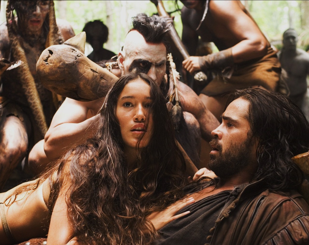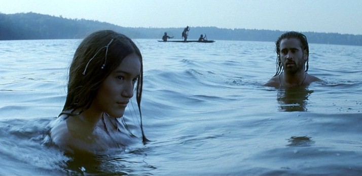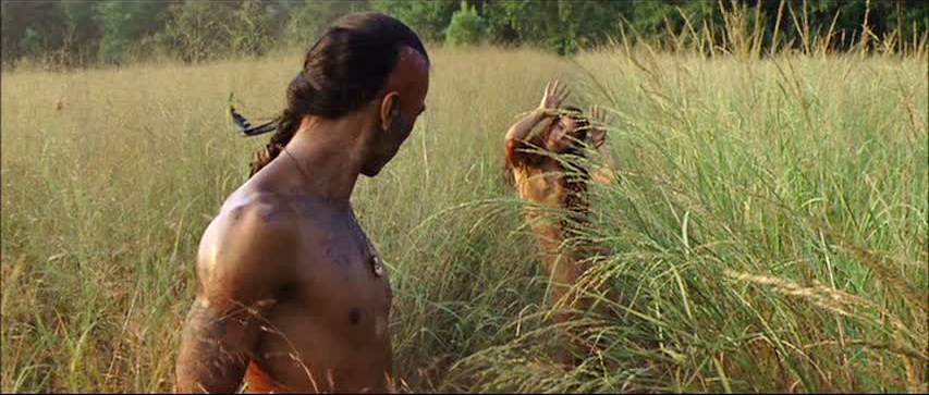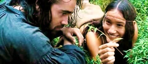 back in his sails. Malick goes a bit overboard on the religious imagery here, embellishing Colin Farrell’s long, flowing hair and Jesus beard by placing a wreath on his head in imitation crown of thorns, before he’s hoisted by the Algonquians shoulder high, arms outstretched in the traditional stance of crucifixion, but it remains in keeping with the biblical theme (later, he’ll suffer Christ’s Passion as well, when he’s whipped and pilloried by his people). Smith has gone to a better place, discovering a different kind of new world among the Algonquians than he knew at the fort – a heaven here on earth. Encased like a sardine before, in heavy steel armor which proved worse than useless (weighing him down, the visor blocking his peripheral vision) when he was beset by the hostile, lightly clad natives who could move about freely, he seemed self-entombed. Still encumbered by the bondage of the Old World, this suit itself was an aperture of entrapment. But once emancipated from the constraints of civilization, Smith discards its physical habiliments as well, doffing both the armor restraining his body along with the armor of inhibitions encompassing his soul. He dresses lighter and lighter, first only in the vestment of trousers and loose, billowy blouse, then no shirt at all. An ever more feral Farrell goes all Dances With Wolves on us, throwing in with the Indians, which doesn’t seem quite as peremptory as it might, considering we’d been tipped to his seditious leanings at the outset. Smith goes native, as Private Witt did in The Thin Red Line, submitting to the Algonquian purification rituals, taking part in their ceremonial rites, being decorated with war paint. His ‘captivity’ in the village really affords him his first taste of freedom. For it’s here that he’s finally found what he’s spent his entire life in search of (“How many lands behind me, how many seas?”).