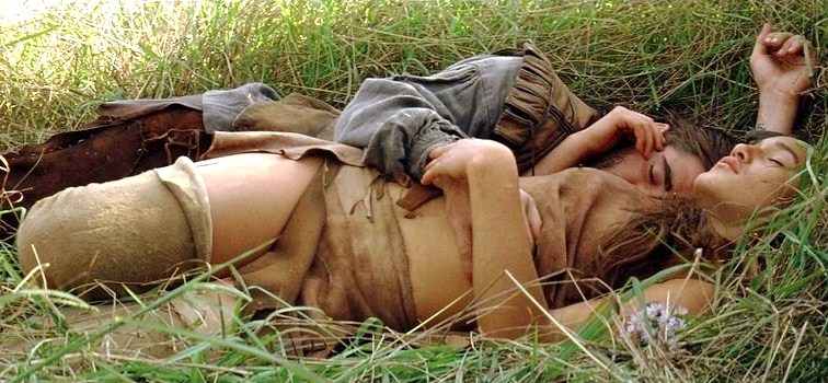 In Terrence Malick movies, the hand clasp is used as a signifying gesture of absolute trust. After the warring whites had shattered the peace of the Pacific Islands in The Thin Red Line, for instance, a native boy he had earlier befriended fled from Witt in fear rather than shake the hand extended out to him. The hand clasp here likewise denotes Pocahontas’ complete confidence in Smith, her certainty that, despite his claims to the contrary, he’s really a good man at heart. When he momentarily loses her trust, she unconsciously shrinks away when he reaches out to her but, catching herself, makes a desperate lunge for his hand, reaffirming her faith in him.