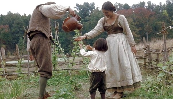 “In my vanity I thought I could make you love me,” Rolfe realizes, turning the dilemma over in his mind, “and one cannot do that, or should not.” She will never truly be his if she doesn’t choose to come to him of her own free will. Rolfe offers Pocahontas her freedom, unlike his polar opposite Smith, whose tainted love becomes a tie that binds her, her word becoming her bond. Rolfe is willing to relinquish his claim on Pocahontas, to chance losing her by orchestrating her reunion with her former paramour, aware of how important it is for his wife to confront her past if she’s ever to lay it to rest. Malick plays the color card here, using these two ‘Johns,’ who share both the same first name and, at different times, Pocahontas’ love, as physical and moral contrasts to each other. The good, blonde one is all sunshine and smiles, the dangerous dark one gloomy and sinister. He even dresses the men alike, paving the way for one of the most exquisitely understated romantic resolutions in recent memory, in which we’re initially misled to believe she’s chosen to remain with one rather than the other. If Smith, whom she wrongly thought decent, destroys Pocahontas’ faith in the pale face, the gentle and sincere Rolfe restores it. “You are the man I thought you were, and more” she sighs, as if truly seeing him for the first time. This woman who fell in love with her false illusion of Smith, who “walked blindly into a situation (she) did not anticipate,” has at last opened her eyes to the romantic truth in the most unlikely of places, finding her ideal in the plain and simple person of her own unassuming spouse.