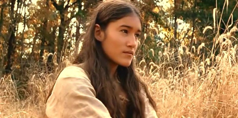vague and unclear, the camera looking up through the water as a blurry Pocahontas splashes at her reflection on the surface above. Although he doesn’t know it yet, this dreamy, amorphous figure will soon crystallize into the realization of his ideal. Initially deprived of a voice, Pocahontas lacks an individual identity or viewpoint of her own. Yet The New World, which begins as the story of John Smith, his search for spiritual salvation and the paradise he and the settlers he shepherded found here in America, does an about face. The director’s sympathy shifts to the Algonquians, and for a time he throws in his lot with them the same as Smith does. Rather than recapping the tumultuous beginnings of this country from the traditional Eurocentric vantage, the film depicts events from a Native American standpoint, as did Dances with Wolves. But then The New World becomes something else again, something quite unexpected and that, unexpectedly, delves much deeper than the director’s comparatively shallow ponderings on Paradise lost. It becomes the story of Pocahontas, the princess the Algonquians cast out, and her obsessively single-minded, self-destructive love for a man whose unworthiness she refused to acknowledge. This timeless yarn has been made uniquely her own but, knowing as we do what the ensuing centuries hold in store, it also possesses universal reverberations. So that she can be accepted as a broader, more representative figure, the movie by intentional design never mentions Pocahontas by name. In fact Malick emphasizes her anonymity. Upon Mary’s introduction, she begins with “And I believe your name is –” only to be cut off: “She says that’s not her name anymore. She hasn’t got a name.” Pocahontas stands in for all women here, the same as her unspecified tribe stands for all those Indian nations brought to wrack and ruin by European interlopers. Hers is a transcendent tale of tears.