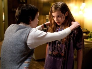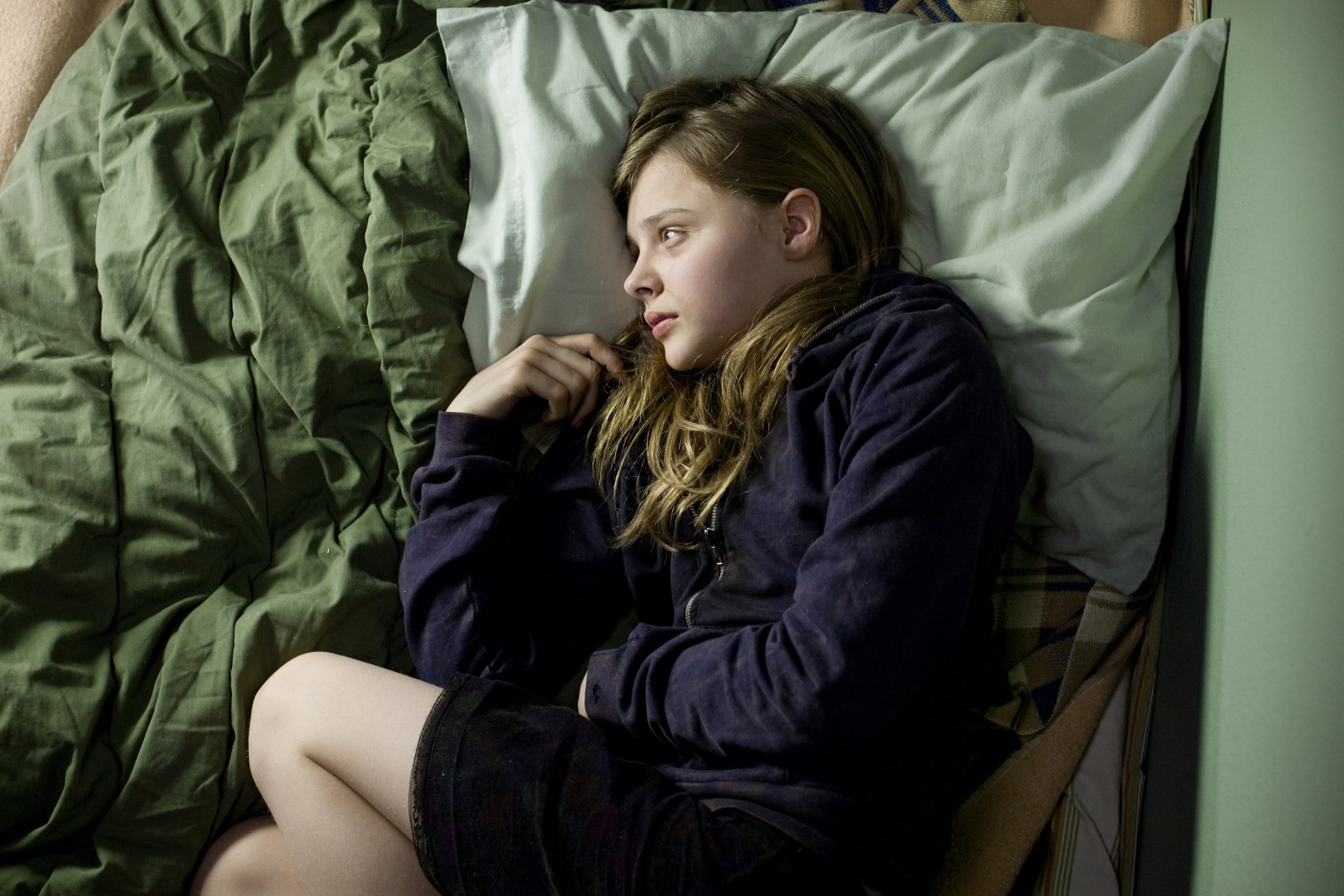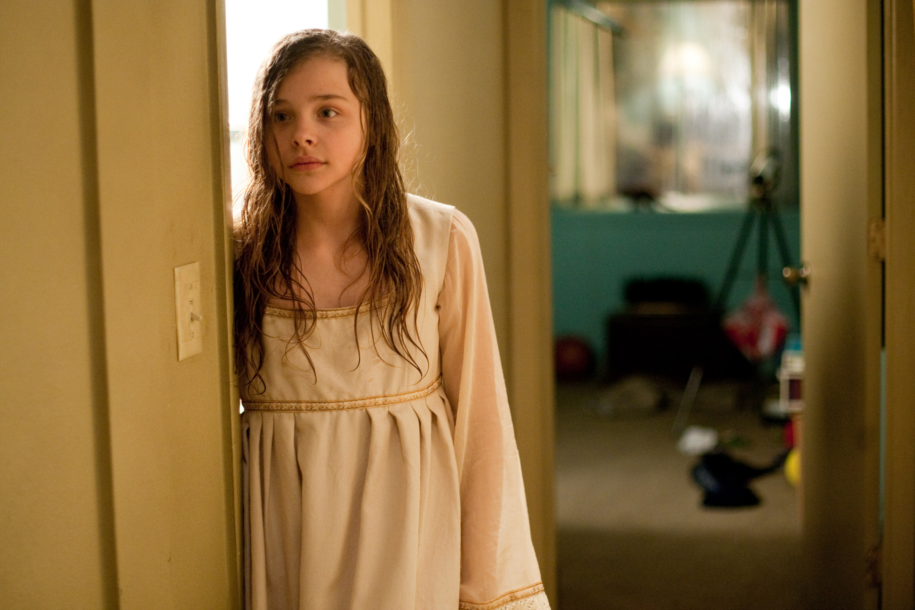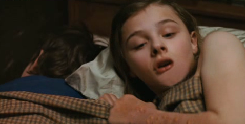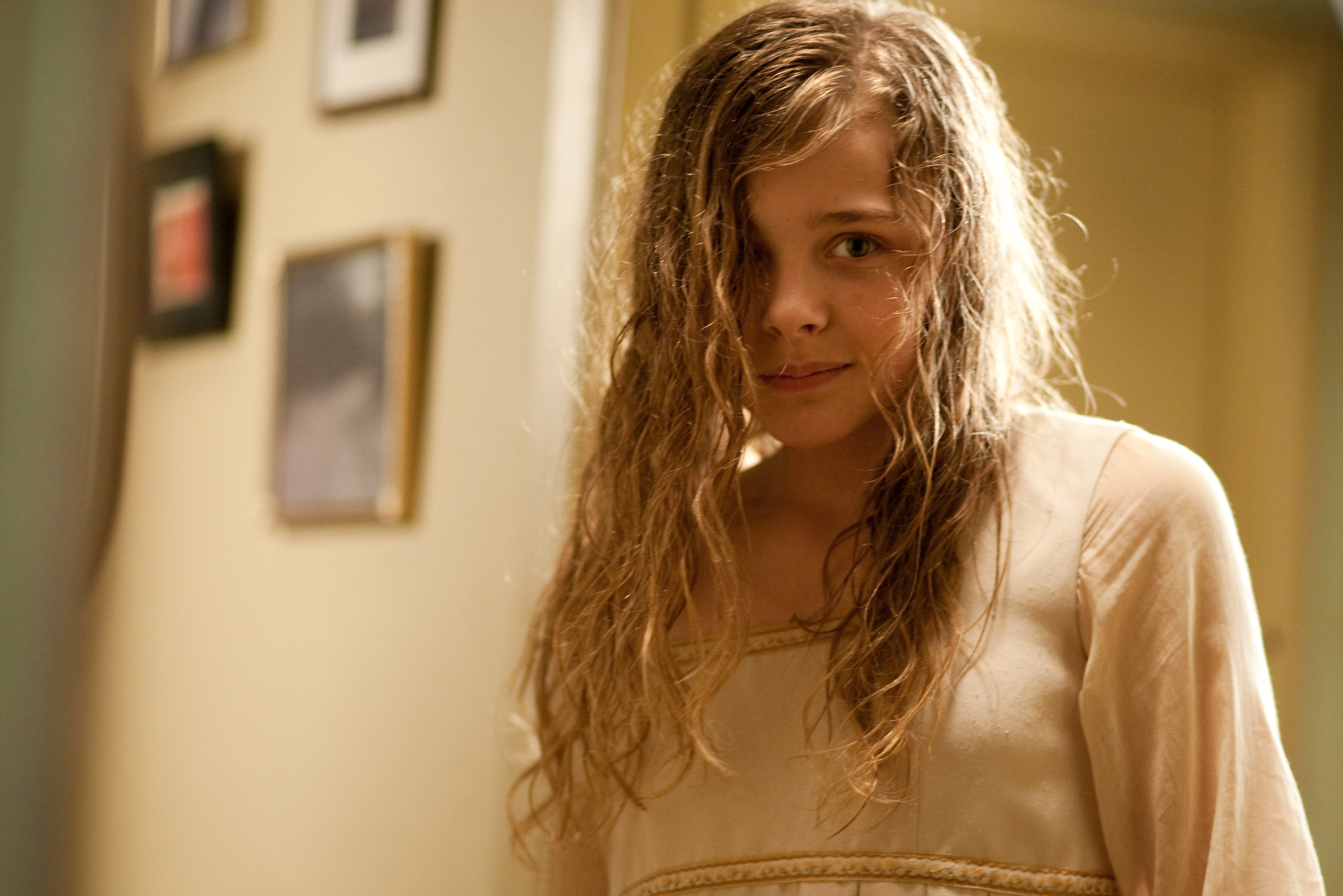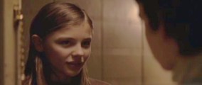 For a girl her age, the actress has taken an inordinate number of challenging, unconventional, risk taking roles in pictures like The Texas Killing Fields (she’s currently cast in the Carrie remake), and her lovely work in Let Me In is every bit as subtly disturbing and finely shaded. Chloё has the woebegone, slightly trampled and abused look Elle Fanning projected in J.J. Abram’s Cloverfield-like Super 8 last year. She can affect the winsome poignancy of Brigitte Fossey in Forbidden Games or the manipulative slyness of Sue Lyon in Lolita. More than anything, her quicksilver emotional changes recall Ellen Page’s turn as another deceptively innocent little girl who’s not as helpless as she seems in Hard Candy.