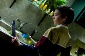 Director-writer Reeves approaches the Abby character as though being turned into a vampire had suspended her in mid-maturation, mentally and emotionally, as well as physically. Despite her unnaturally long life, he believes in her assertion that she’s still a twelve year old, “But… I’ve been twelve for a very long time.” Reeve’s unique approach would seem to make sense, even if it flies in the face of long-held lore and other cinematic takes on the subject. Let Me In adheres to established vampire superstitions concerning such matters as being invited in and the inexplicable, obsessive compulsive bent of bloodsuckers who are compelled to unravel knots and puzzles, while cavalierly discarding others (this vampire can even be photographed).