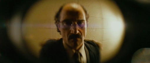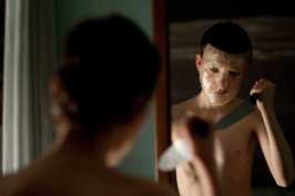 The first time Owen goes through this ritualized form of self abuse, it’s with mask full on to obscure his identity from himself, same as his true motivations are obscured from the audience. The mask he wears was actually molded from the face of actor Richard Jenkins, who plays Abby’s ‘father,’ making it clear that the movie wishes to establish a link between the two. By wearing this mask, and in doing so appropriating his features, Owen, who succeeds him as Abby’s new caretaker, threatens to grow into the same man The Father has become. Hence, when the two lock eyes across the courtyard, it’s really another mirror reflection, though we don’t fully realize it at the time either, because Owen’s eventual older self remains unrecognizable, ‘masked’ to his younger.