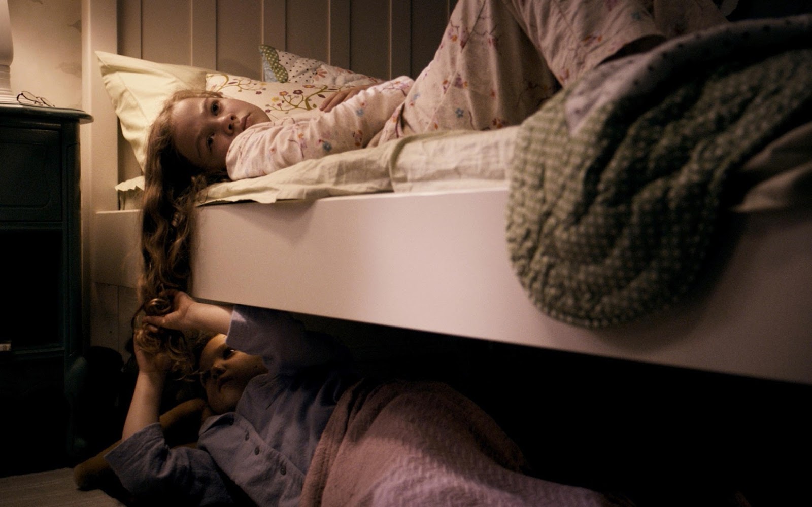 In some ways the girls recall the uncivilized backwoods twins played by Jodi Foster in Nell and for her part, Annabel’s attempts to reach the feral foundlings may remind you of Annie Sullivan’s efforts to communicate with Helen Keller. Lilly was taken away so young she hasn’t been as socialized as the older girl, which is why she proves resistant to being civilized. In many ways she functions like Victoria’s shadowy animal spirit, gnawing on her hair for nutrition, eating bugs, taking her meals on the floor like a pet rather than at the table, and sleeping under her bed instead of in it, just as Mama does in Annabel’s nightmare. It’s only the glasses that allow Victoria to adapt, reminding her of the life she once led, reaching the civilized soul within.