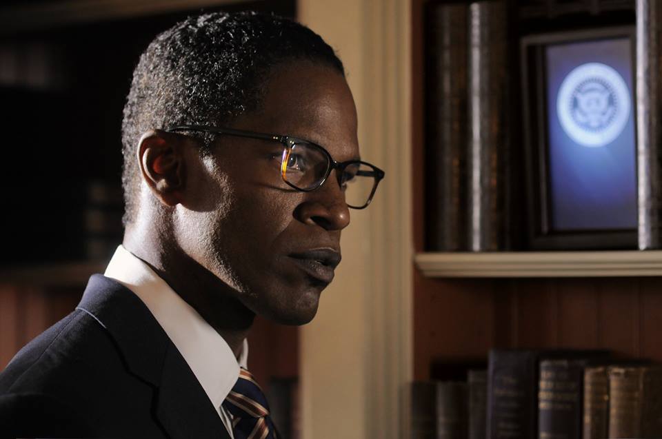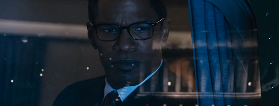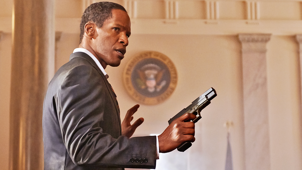 Long before he played Ray, won an Oscar and began being taken seriously, Foxx started his career as a slapstick comedian, alongside Jim Carey, on the Wayans Bros.’ early 90’s sketch revue In Living Color for Fox. His talent for mimicry coupled with the entertaining array of characters he created helped snag him his own starring series on the WB, The Jamie Foxx Show, in which he played opposite Garcelle Beauvais, who has been cast as First Lady here. After all these years, the actor has retained the rhythmic comic timing he was forced to develop, of necessity, to meet the rigorous production schedule of a weekly television show and it comes in especially handy given Emmerich’s relentless pacing. The only ease of tensions there is comes from Foxx’s performance, which is composed of smooth, self-assured asides. Watching his co-star attempt comedy on the other hand creates another form of suspense entirely, we hold our breath waiting to see if he’s going to topple off his high wire and fall flat on his face by murdering the punchline. A seasoned professional at this sort of thing, Foxx