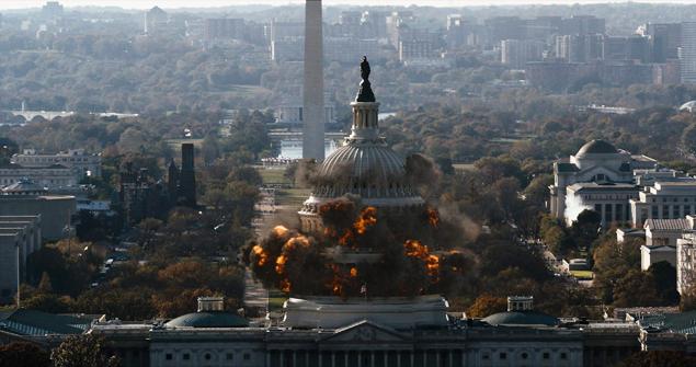 White House Down, following on the heels of the more sober-minded Olympus Has Fallen, with its similar premise a few months ago, likewise captures the siege mentality of a country that now sees itself in perpetual peril on its own soil, assailed from all quarters by the threat of terrorist attack. By taking this fear to the extreme, into the very seat of government itself with this penultimate home invasion nightmare, the script kids those fears, while at the same time playing into the jingoistic paranoia that’s become a permanent byproduct of 9/11. Americans have rarely suffered the indignity of invasion as during the War of 1812, Pearl Harbor, 9/11 and so are more incensed when threatened on home turf. White House Down is meant to arouse our territorial instincts, even more so on a holiday intended to celebrate the nation’s birth. A movie is not all in good fun when we see a heat seeking missile bringing down Air Force One and the primary purpose appears to be recalling memories of United 93. When explosives cause the capitol dome to collapse upon itself like a house of pancakes, we’re watching the Twin Towers fall all over again. Vice President Michael Murphy takes the oath of office with a hand heavily bandaged, indicating America’s wounded state.