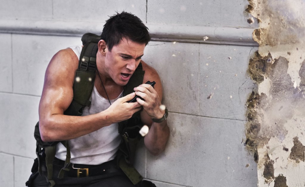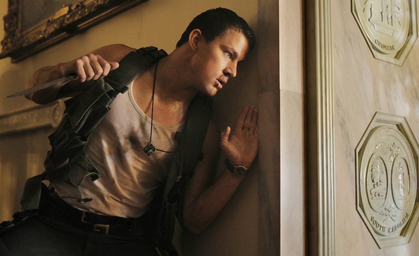 innocent people are worth the sacrifice of her life, it immediately follows a similar setup where Cale would have been forced to make a Sophie’s Choice between turning his president over to the terrorists or sacrificing his daughter. Having Sawyer hand himself in ethically exonerates Cale, but by not forcing the issue, we never learn what he would’ve chosen to do with a gun to his own head, betray his country or his little girl. Like Magic Mike and many of the other characters he’s played since Step Up, Tatum’s Cale is fighting an uphill battle to ‘prove himself’ in the eyes of a world that looks down on him. Specifically, he wants to prove himself worthy of the Secret Service that rejected him as unfit for duty. The entire affair affords an excuse for the character to demonstrate his utter superiority to the caliber of men manning that department. The way the script would have it, with the Secretary of Homeland Security dead and the Secretary of Defense doing such a shoddy job, Cale is the only qualified person capable of performing in a crisis situation, using his guerilla tactics to protect the president and take back the big house, as more qualified officers are bumped off right and left. His being turned down for the job is just one more sign of the Secret Service’s utter incompetency.