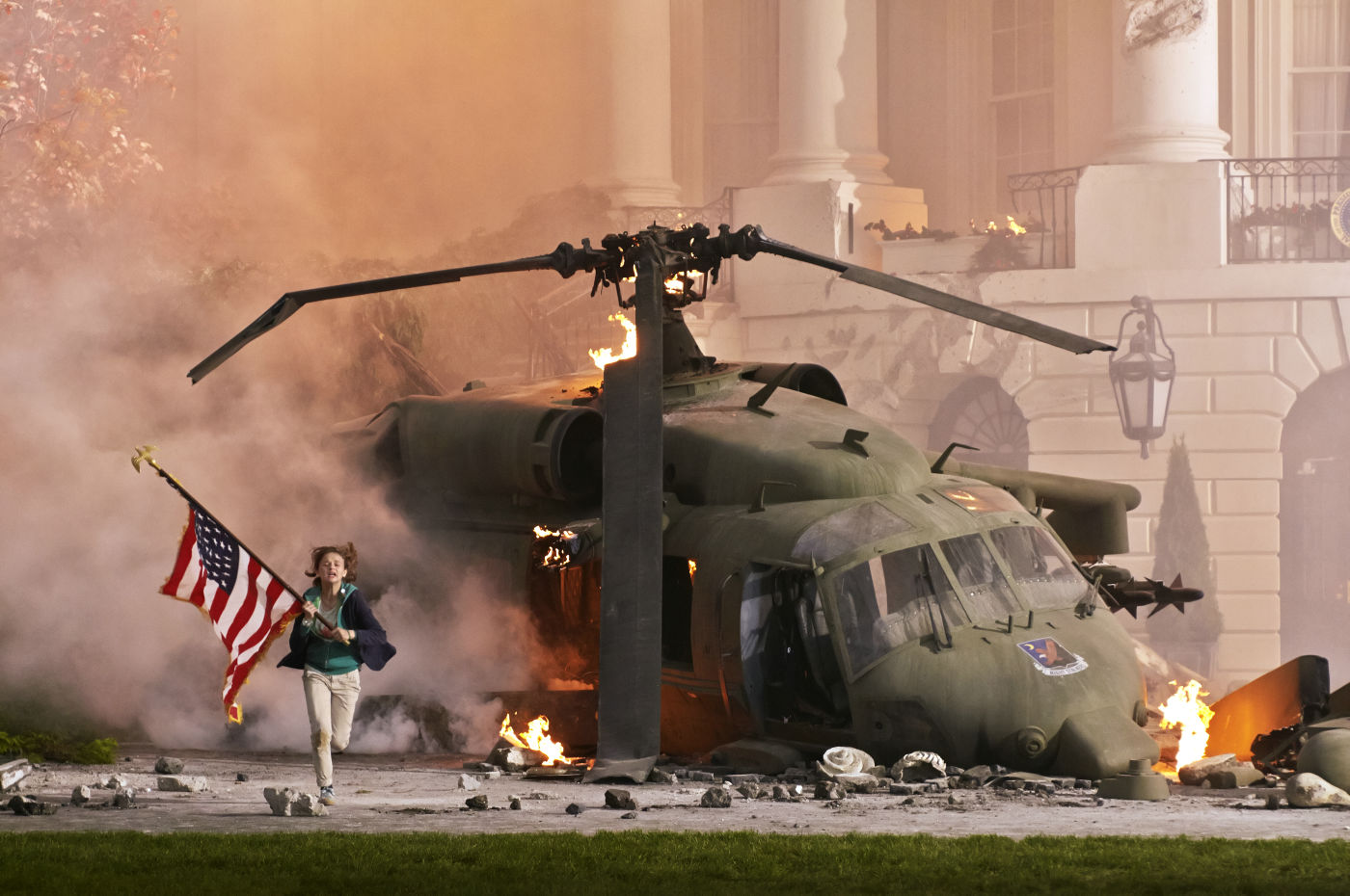 The nation’s most sacrosanct domicile is turned into a big romper room for its overgrown stars to rough house in. White House Down seems to derive puerile delight from defacing priceless national treasures. While the terrorists are disparaged and vilified for setting such little store by the one of a kind artifacts they destroy, indiscriminately shattering irreplaceable Ming Dynasty vases and defacing a portrait of Washington similar to the one Dolly Madison saved when the British stormed the capital during the War of 1812, the movie and its maker are in convivial kindred spirits with them. The director of Godzilla, The Patriot, The Day After Tomorrow and 2012 shares their same crash and boom sensibility, a real taste for apocalyptic annihilation. It’s a wonder Emmerich didn’t choose to take his movie out on a bigger bang by completely demolishing the building all over again, razing it to the ground and ringing down the pillars with rollicking abandon, rather than cheerily dismantling it piece by piece.