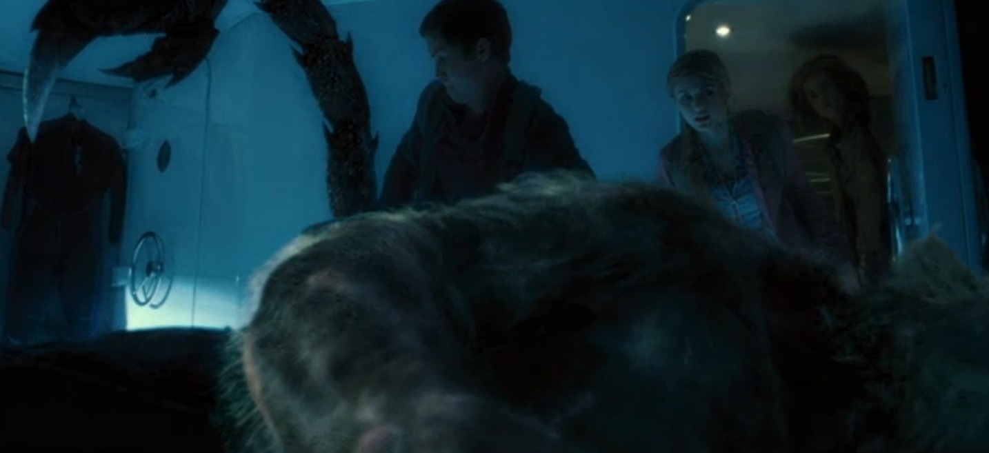 Rather than focusing exclusively on the father-son conflict this go round, Sea of Monsters instead expands upon the idea of extended family by having Percy discovering that his father sired even more illegitimate offspring, a teenage Cyclops by the name of Tyson (but then wasn’t Polyphemus also supposed to be a son of Poseidon?). One might expect some festering hurt feelings to accompany the kid’s attempt to come to terms with the revelation that he has a half-brother-from-a-different-mother he knew nothing about, especially after he observes the same father who won’t acknowledge his existence lavishing preferential treatment on his one-eyed son. Poseidon immediately answers Tyson’s prayer for help by sending a hippocampi, which resembles a pastel colored pinto pony from the upper half and a finned eel from the lower (a cadborosaurus?), to transport the party out to Luke’s offshore yacht. Yet wide-eyed Percy casually shrugs off Tyson’s unexpected existence without so much as a double take (after everything else, it hardly seems a shock).