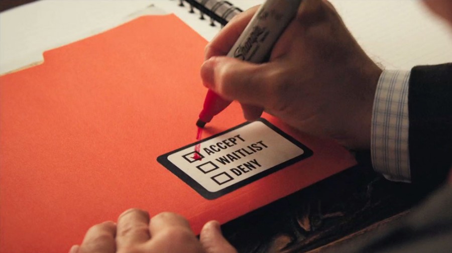 best school in the country. Nor would it be considered so prestigious to be admitted. I’m reminded of that old Groucho Marx line about not wanting to belong to a club that would have him for a member. And the movie is unlikely to deter any college-age applicants from aspiring to a competitively cutthroat Ivy League education. In fact, if the movie had targeted the right-aged audience demographic, it likely would’ve sent applications skyrocketing, the way Love Story did requests to Radcliffe. Portia explains more than once during her annual recruiting road trips that she’s not touring schools to tell her eager young audience how to get into Princeton, but from the plethora of sample applications the movie runs by us, it’s easy enough to gather our own idea concerning what it takes, what qualities the admissions board is looking for. And though the movie treats the Ivy League as a breeding ground of selectivity, from what we gather it’s not the privileged few who are accepted but the hard luck cases who have overcome major obstacles to succeed academically. The most imaginative scenes in the movie have these hopeful aspirants themselves appearing in the same surrealistic space as the admissions officers reviewing their files.