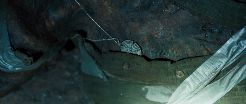 the suspect’s walls, scribbled on scrap paper, contained in children’s books, medallions. But while it’s impossible for the kidnap victims to find their way out of the labyrinth presented to them, and hence no way to escape their captors and go home, the similar challenge presented the movie audience is quite soluble. Once we grasp the answer to Prisoners’ puzzle, we’re released to return home as well, but with the God’s-eye view of things we’ve been accorded by the omniscient director, we can cheat. Seeing the grand design behind it all makes it a cinch to navigate our way through the corn maze. We remember where we’d seen that image the suspect feverishly maps out long before Loki ever does, proving almost as impressive amateur detectives as Keller does himself.