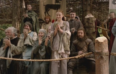 fact that what is really being used to dull people’s pain is opium. Though an elaborate, entirely invented language has been created for the Dothraki to speak, the way familiar words are twisted to no feasible purpose, like Maester instead of Master, Benjen instead of Benjamin, Joffrey instead of Jeffrey, Ser in place of Sir might be attempts to mirror Old English, or may simply be ornamental flourishes. Maybe George Martin, who serves as the series’ co-executive producer and is contracted to pen one episode per season, just likes being diff’rent. Absorbing and compressing allusions to everything from King Arthur’s court and the knights of the Round Table to Beowulf, The Song of the Nibelungs, Henry VIII, The Twelve Caesars, Norse Sagas, the Great Wall of China and the emperors’ Dragon Throne, the Age of Exploration, Genghis Khan’s Mongol hordes, and jousting tournaments during which all that seems missing is Robin Hood, at times Game of Thrones smacks of Renaissance Fair.
