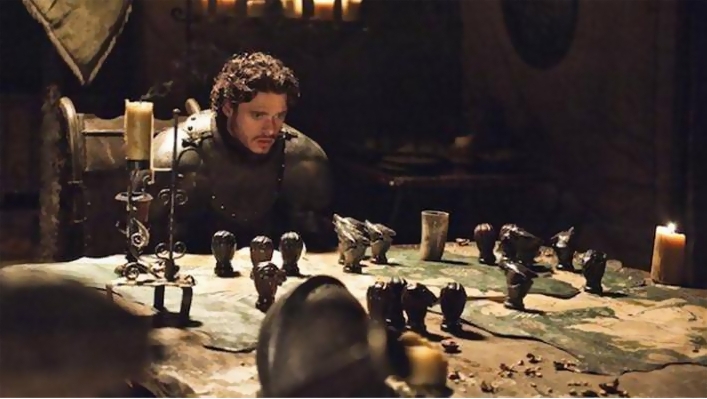 As Robb, the eldest Stark son formulates a plan of attack with his military strategists, it’s no coincidence that their battle map is decorated with paper weights that cause it to resemble an oversize chess board itself. It looks similar to the Emmy-winning title design that comprises the opening credits, set against a 3-dimensional atlas that whirs to life with gears and springs like pop up storybook art. Pinning all the additional realms we’ll visit that night, it’s accompanied by Ramin Djawadi’s thrumming score, which suggests the melancholy strains of traditional Scandinavian ballads as practiced by strolling troubadours.