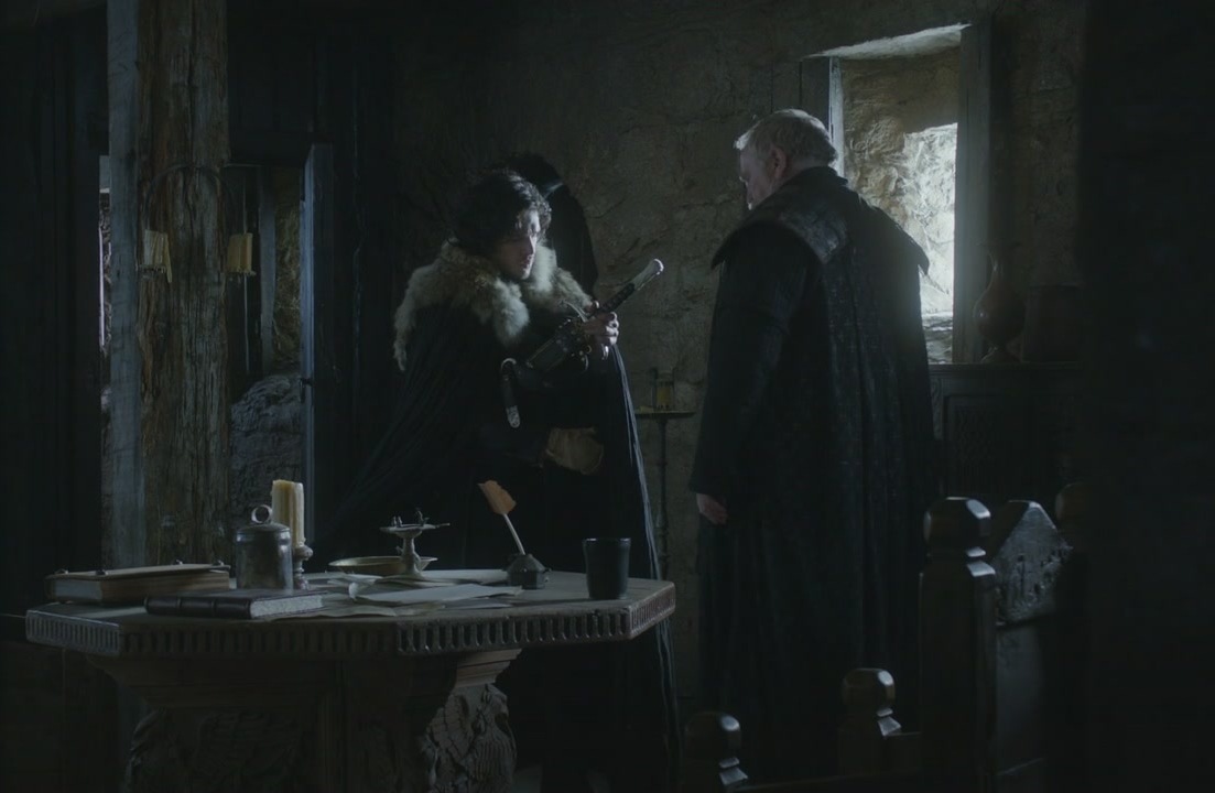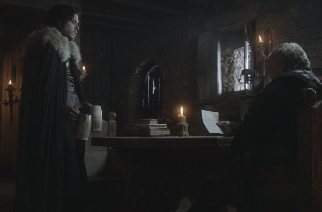 Reiterating the vows he took, in tandem with them, reminds him that he made a pledge of honor to man his post (“I pledge my life and honor”), that is just as strong as the call to duty drawing him away, to join his brother’s campaign (“Do you think your brother’s war is more important than ours?… When dead men and worse come hunting for us in the night do you think it matters who sits on the Iron Throne?”). Torn between which oath of honor takes precedence, Snow’s internal conflict is made palpable, even to the Lord Commander who empathizes, “Honor made you leave. Honor brought you back.” When Jon amends that it wasn’t honor but his friends who brought him back round, his commander clarifies, “I didn’t say it was your honor.”