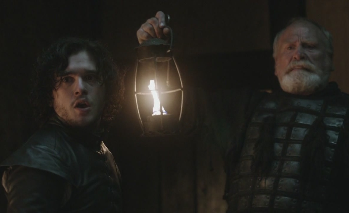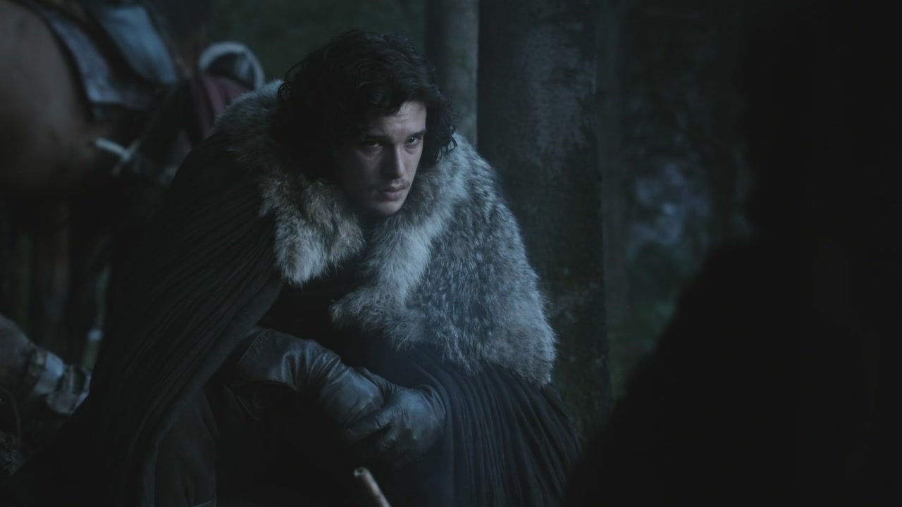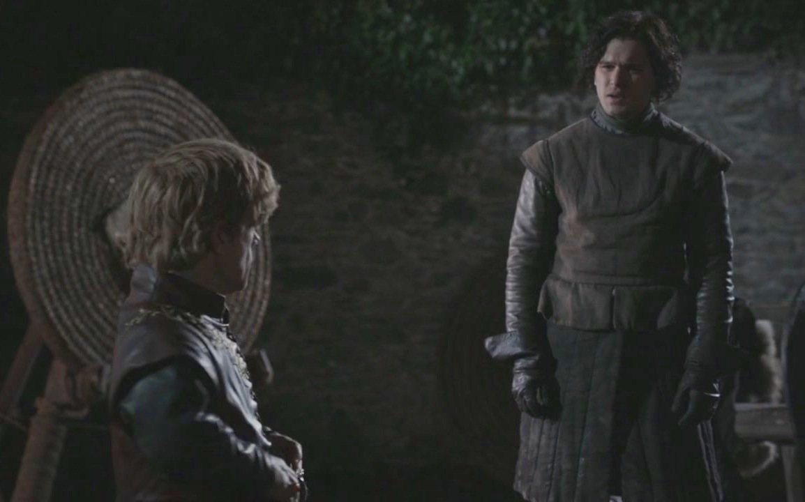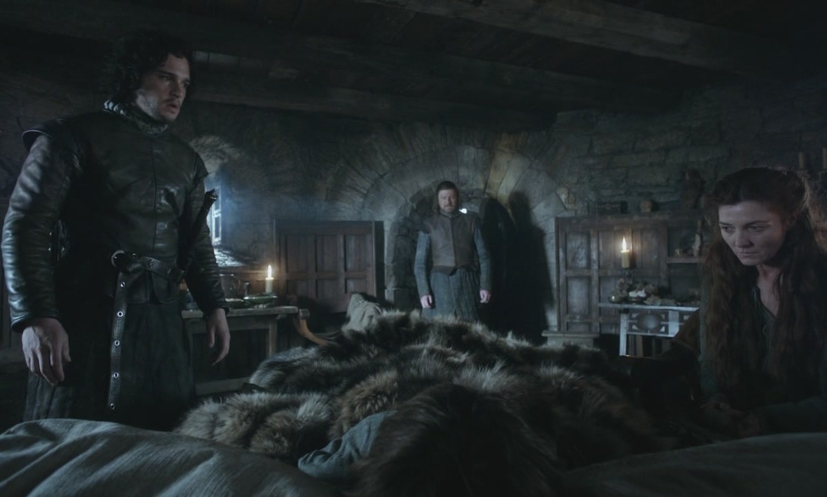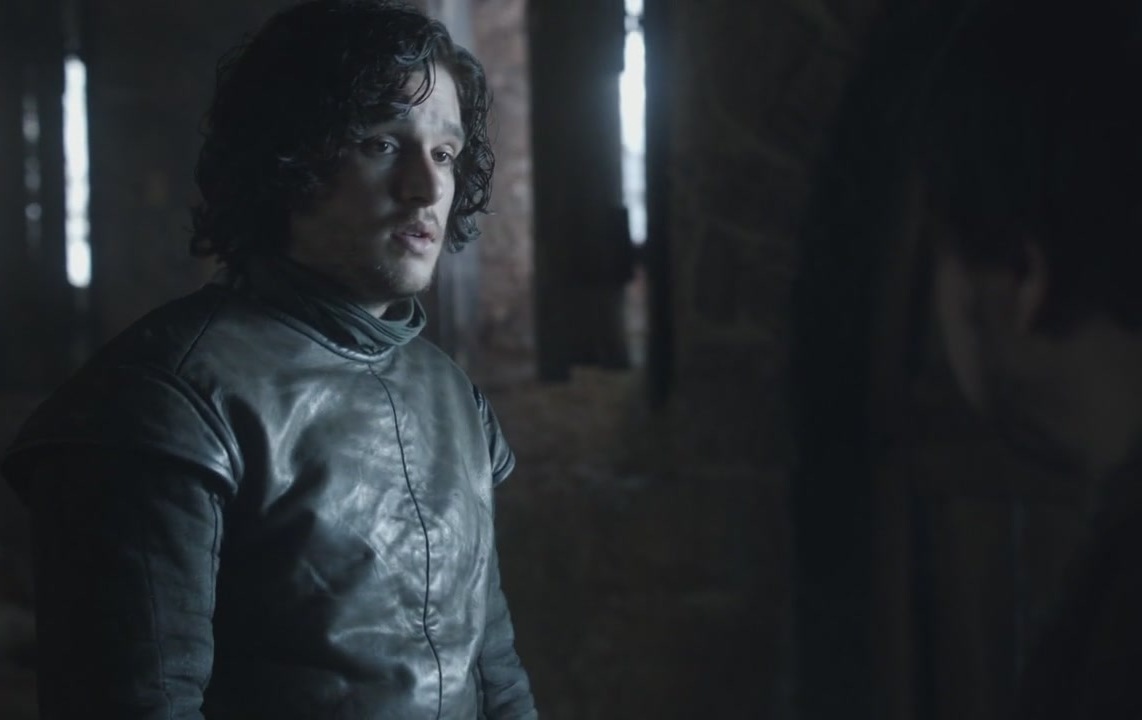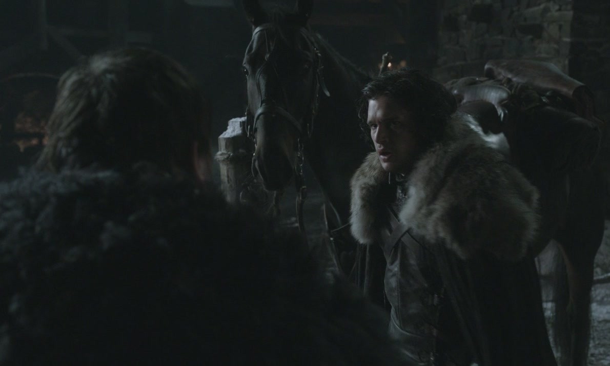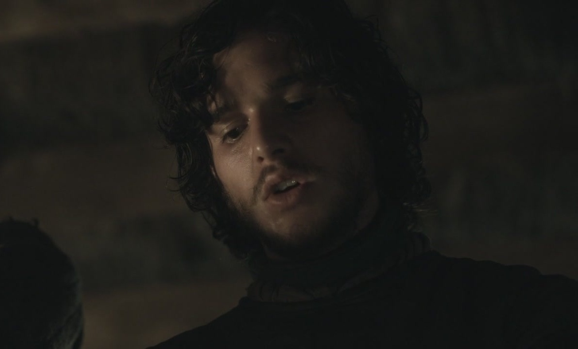he seems slightly terrified of her. Taking his leave of Winterfell, he chivalrously fibs to Robb that his stepmother spoke kindly to him at the last, though the reality proved quite the opposite, Catelyn purposefully ordering him away from her stricken son’s bedside with the words she’s always felt in her heart, “I want you to leave.” By lying to uphold a lady’s honor Snow already seems something of a knight to us before he’s even joined the Watch. His unnecessary act of gallantry just goes to prove his highly principled father is correct when remarking that “you might not have my name, but you have my blood,” as well as the same noble streak that goes along with it.