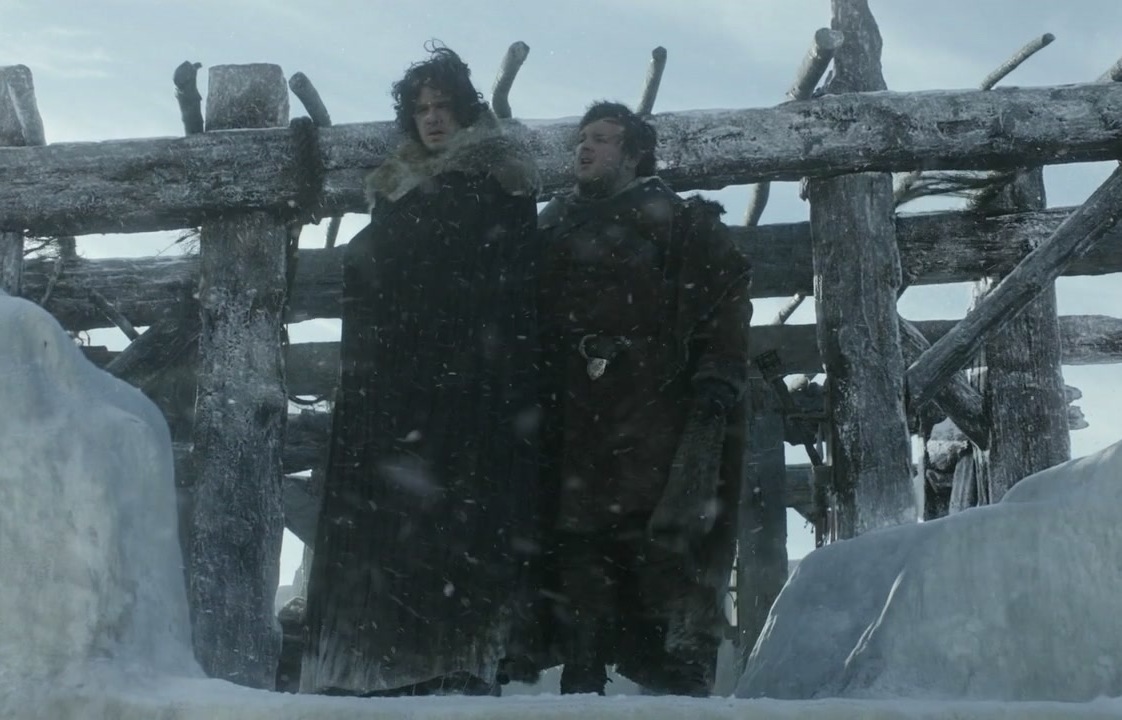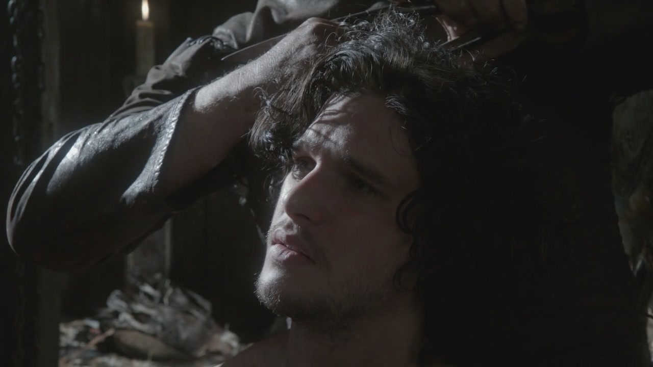 “Lord Snow grew up in a castle. Spitting down on the likes of you,” Thorne jeers and he certainly does seem lord of the snows here, in the frigid, godforsaken wastes where the wind howls constantly and the flakes fall so thickly it’s as if his world had been shaken up in a snow globe; Jon Snow in the icy North trying to stave off the coming winter. At the bottom of the rung in the Stark household, Snow rises to the top of the heap on the Night’s Watch, and in the