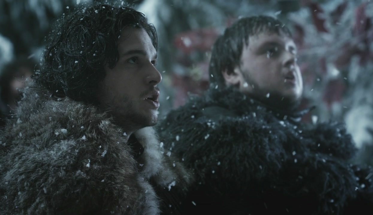something of Snow’s unofficial squire on The Wall, comical Samwise to his tortured Frodo, with a dash of the cowardly lion thrown in, to make him more lovable. “You may be a coward Tarly,” it’s widely acknowledged, “but you’re not stupid.” Indeed, it’s Sam who proves to have studied up on the White Walkers rather than Snow who disparaged Tyrion for reading so much. Sam’s merry comicality perfectly offsets his friend’s taciturn melancholy and they make a surprisingly good pair (he seems the only character capable of making sullen Snow laugh). Having once felt himself superior to the other lowborn recruits, Snow now selects the lowliest among them for friend and confidant. It is with Sam that he shares his slight sexual history and his earnest explanation as to why he couldn’t consummate the act (“Cause all I could think was what if I got her