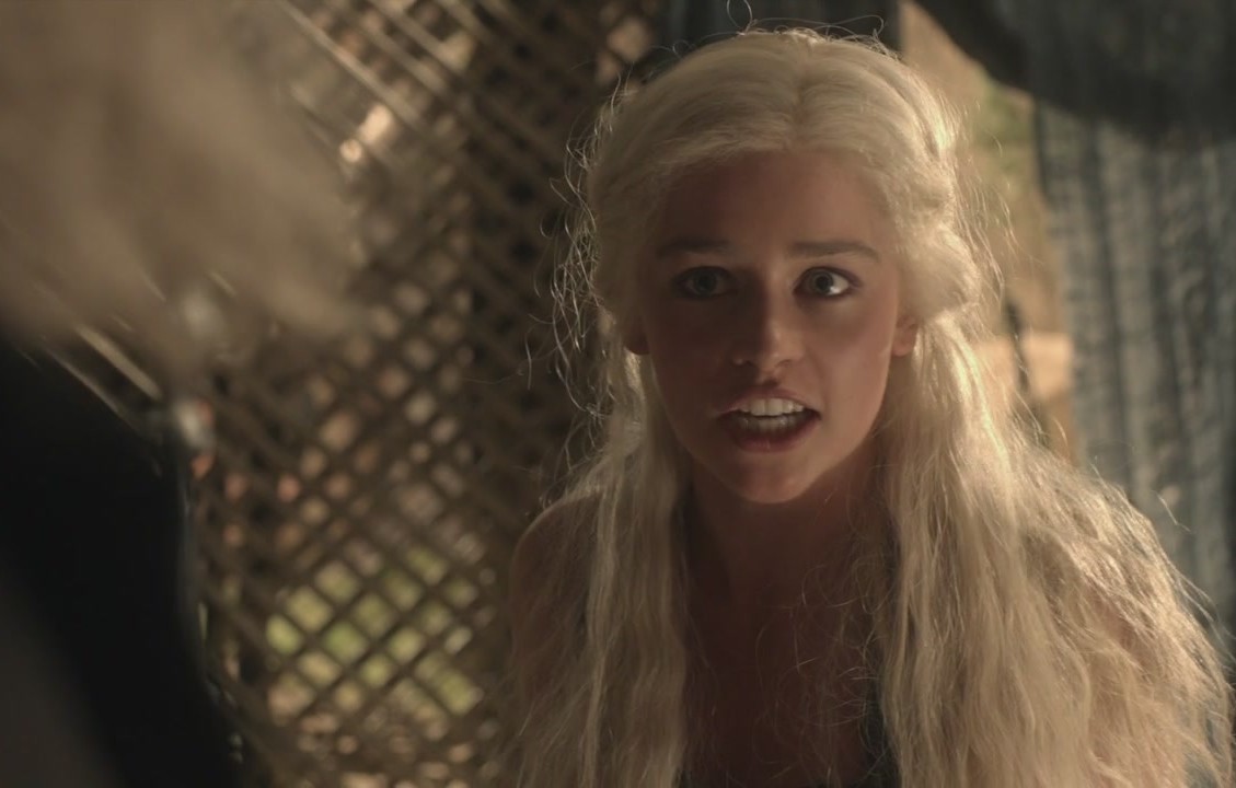 Allowing herself to be sold into marriage like an obedient child who docilely does what she’s told, Daenerys is given no voice in the political games in which she’s maneuvered, not even when she objects to being mated with the hulking, barbaric, monosyllabic chieftain who terrifies her. The one word Drogo knows in her language, ‘no,’ is also the one word he can’t understand, forcing himself on his young bride. It see