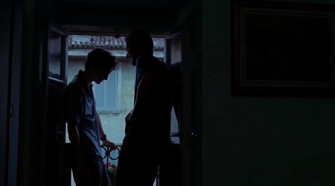 Sharing such close quarters forces them into repeated proximity to one another, so that they’re practically intimate before they get to know each other intimately. Elio can’t even get out of his room without going through the communal bathroom, so the two are constantly bumping into each other in various states of undress. They invade one another’s privacy time and again without even knocking, leaving Elio to think up embarrassing excuses as to why he can’t get out of bed at the moment, when Oliver bursts in on him masturbating. Their swimming trunks are even draped around the tub to dry as if they were delicates or sheers. They might have picked up each other’s scent, as when Elio pulls Oliver’s shorts over his head or, when playing with his arm pits, editor Walter Fasano cuts to a shot of an approaching Oliver similarly wiping the sweat from his own. They’ve reached such a comfortable degree of intimacy by this point, when they do start sleeping together it seems the perfect cohabitating arrangement, affording them direct access to one another and complete privacy from the rest of the household, a secluded Eden where they can lock out the world.