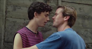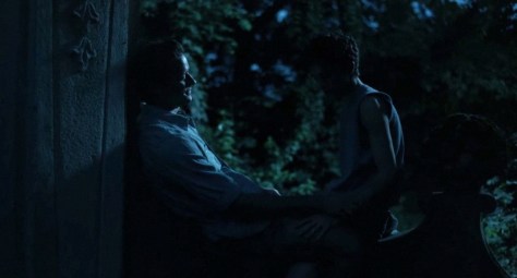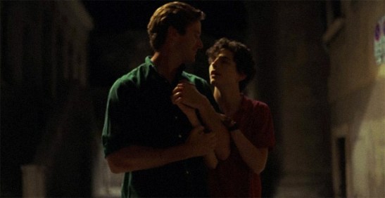 The open, happy, long-term companionship they share is used as marked counterpoint to Oliver and Elio’s furtive first encounter, with the two creeping around in the shadows trying not to make any noise and scrambling back to their own rooms before it gets too light. But Elio’s dismissive references to the effeminate couple as ‘Sonny and Cher’ tells us he doesn’t see himself, or his feelings for Oliver in the same light, that he’s blinded himself to the obvious, as Sufjan Stevens’ Simon & Garfunkel-like “Mystery of Love” states “Oh, to see without my eyes/The first time that you kissed me.” Elio even calls himself a ‘pussy’ at one point for pining after another man, and by repeatedly having sex with Marzia, attempts to make himself feel more masculine,