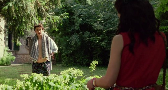 The film amuses itself by overemphasizing the point the subsequent morning, as Elio proudly boasts in a two-shot, with Oliver sitting right beside him, “We almost had sex last night –” then for clarification, “Marzia and me.” But the declaration is as much for Oliver’s benefit as a play on words for ours, a sly attempt to make him envy what he’s missing, payback for the way it made Elio feel to watch Oliver dancing with someone else, while desiring to be in his partner’s shoes himself. This amusingly darting competition will continue when Chiara subsequently stops by the villa, and only half joking asks if Elio would like to help hook her up with Oliver, to which he honestly answers “No,” with unusual candor for someone who rarely says what’s actually on his mind.