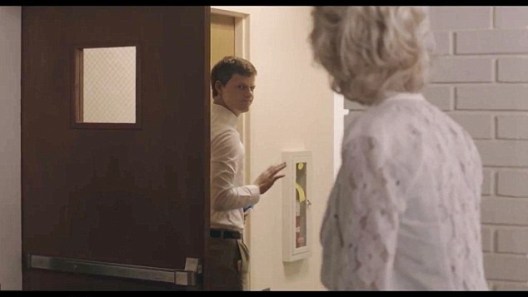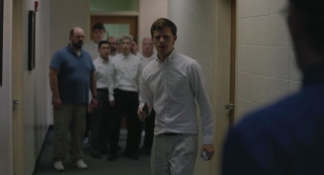 While Jared feels compelled to hear him out and absolve him, like a Catholic priest delivering last rites, despite the personal turmoil he’d just been out through. Understandably confused and all out of sorts following this encounter, Jared’s left swimming against the tide as he moves down the hall in the opposite direction as everyone else. Having been turned around, he’s a nervous wreck who keeps a sharp eye out lest he accidentally run back into the predator who expectantly waits for him to appear for running practice as if nothing had ever happened. So before he ever enters rehab Jared already appears to be just half a person, part of him, the person he thought he was, having been peremptorily erased. Which explains the director’s repeated use of imagery that divides his face through lighting or architecture, to express his inner conflicts. And it’s a sword that cuts both ways. The effort of Henry, for instance, to remain chaste and holy by repressing his sexual drive, simply results in it percolating dangerously just below conscious level, before unexpectedly erupting in instances of sexual violence. Forcing himself on Jared is not even the first time he’s succumbed to his urges, alluding to “something bad (that) happened between…” him and another kid he’d nodded greetings to at the revival.