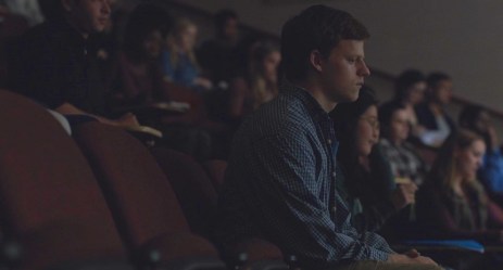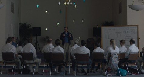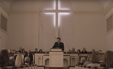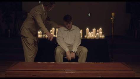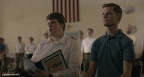 The converts are required to publicly share their most intimate personal stories of same sex attraction not just in front of the entire congregation, but in front of a recording camera for posterity. The rationale for this public pillorying isn’t clear, unless additional shaming were considered part of the healing process, like those confessionals in Novitiate where the sisters laid their souls bare for picking over. Sara is forced to graphically relate her first experience with another woman in front of a room full of horny teenage boys, as if she were being used to titillate their latent heterosexuality, teasing it out with the explicit talk. Offering himself up after what he witnessed with Cameron, as the next sacrifice on the altar of sexual persecution, Jared’s final testimonial becomes a push you, pull me confrontation with the satanic Sykes who challenges him, trying to dig into him, to see what he’s made of.