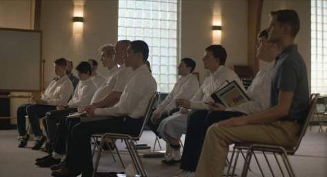 When not being locked up for public indecency, gays were being imprisoned for sexual insanity, and these religiously run conversion clinics seem artifacts dating back to when being gay was seen as synonymous with mental disorder, justifying commitment and shock therapy. Having had ‘the fairy fried out of them,’ as did Ewan McGregor in Velvet Goldmine, to the point where all that’s left are the pitiful remains of who they once were, these boys lose something vitally human and humane along the way toward conversion, becoming bland, blank-eyed, unquestioningly obedient automatons. They can be heard intoning the party line like Hitler-Jugend, repeating self-affirming mantras that they’re not broken, that God still loves them, as we see them slowly replaced by pod people, socially acceptable shells of their former selves who can be more readily assimilated back into mainstream society. The hair-raising litany of behavioral modification techniques and aversion therapies being applied is intended to turn out a malleable army of Manchurian candidates.