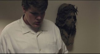 Flitting like a caged tiger through the dim byways somberly illuminated by only the natural luster of self-enlightenment, Jared’s eyes fall on fleeting shades of cowed converts hidden away in the cells he passes. Huddling together for comfort in their gleaming white button ups, the boys are called upon to stand witness to an arcane form of ritual purification, revived by the church only in the most extreme of situations, and their frozen tableaux suggest the Stations of the Cross. But while Jared is shown to be more sinned against than sinning, he still doesn’t prove the movie’s primary, pilloried, Christ figure. That honor goes to the Cameron character (Britton Sear), whose ample size makes him an easy target for teasing in group sessions, as Vincent D’Onofrio’s did in Full Metal Jacket (Flea might be doing R. Lee Ermey’s drill instructor bit from the same film). Standing silent witness at this inquisition, Jared watches him martyred to the cause, as Cameron literally has the hell beat out of him, with bibles instead of a batting cage, volunteers being called out of the audience to participate in the public shaming.