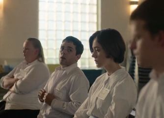 The slightest suggestion of carnality in those interred within Loving in Action’s walls is rigidly suppressed with a set of Draconian rules and regulations that must be abided by at all times. Discouraged from arousing sexual desires, women are required to wear long skirts and modest bras at all times to dowdy themselves down, and the boys forbidden from doffing their shirts even in the sweltering heat. Yet this dress code seems more stringently applied in some cases than in others. There’s no reason to believe, for instance, that Troye Sivan’s Gary wouldn’t have been sheared the second he stepped on the grounds sporting that platinum