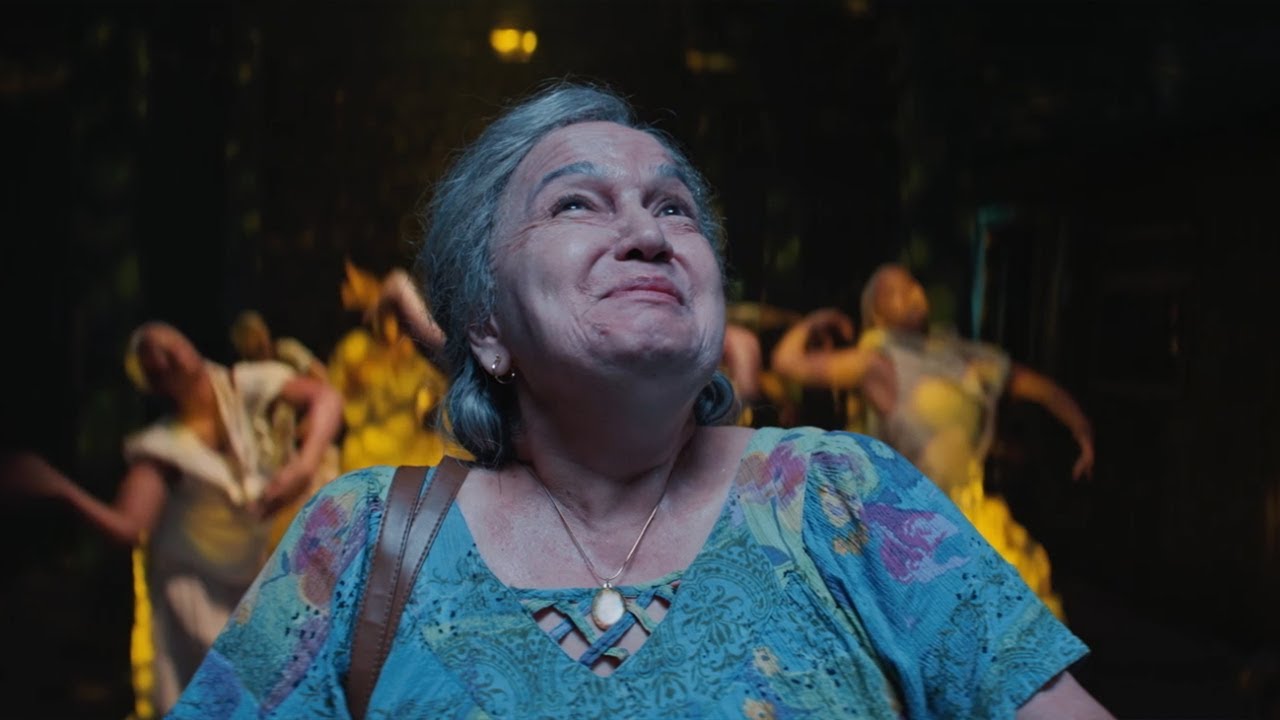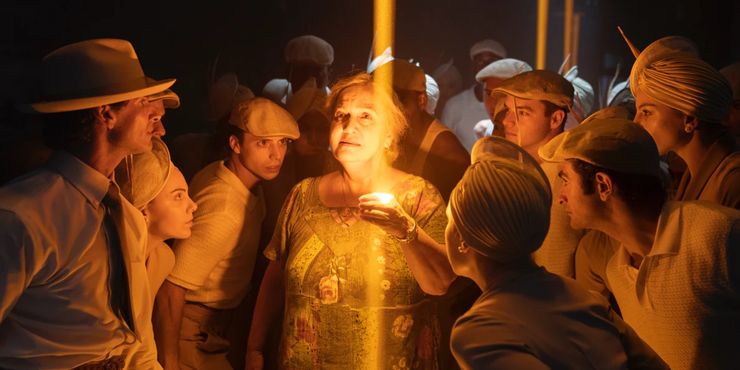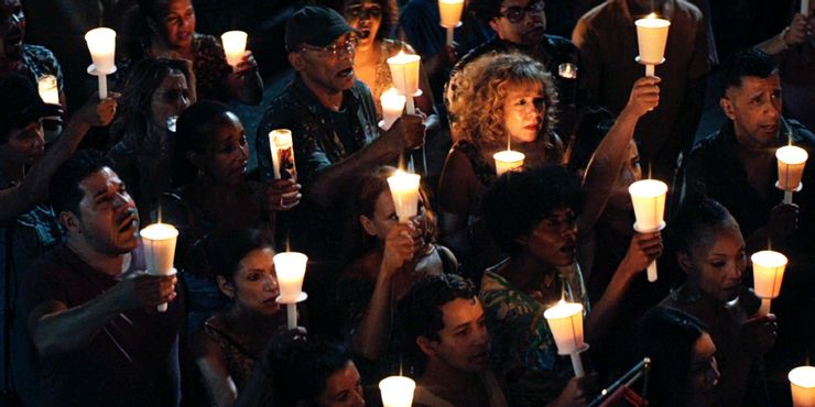 The movie takes an overcharged turn toward the symbolic when even these lights go down during the blackout, leaving everyone in the Heights cast into darkness, helpless as their neighborhood is slowly swallowed up and dispersed to the winds. Even Abuela Claudia’s guiding light, which once illuminated the entire community, is snuffed out, replaced by the unified sea of candlelight, when all the neighborhood residents amass one final time, to pay their last respects (“Alabanza”).