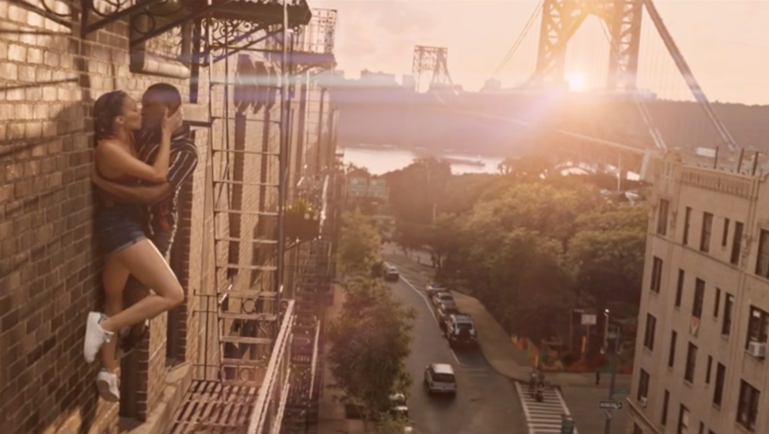 We’re proffered an idealized fantasyland that can be nearly surreal in its silliness at times, such as when the bewigged mannequins in the beauty salon join the chorus, like those singing stone busts from The Haunted Mansion. Or when Nina and Benny (Corey Hawkins), the dispatcher at her father’s car service company she rekindles a romance with, defy gravity by dancing up the side of a vertical building (“When the Sun Goes Down”), like Fred Astaire in Royal Wedding. Or Spider-Man. When characters ‘draw’ on screen by creating shapes with their fingers, the images they’re making are visualized for us, as if we were watching them Etch-A-Sketch ideas in the air.
