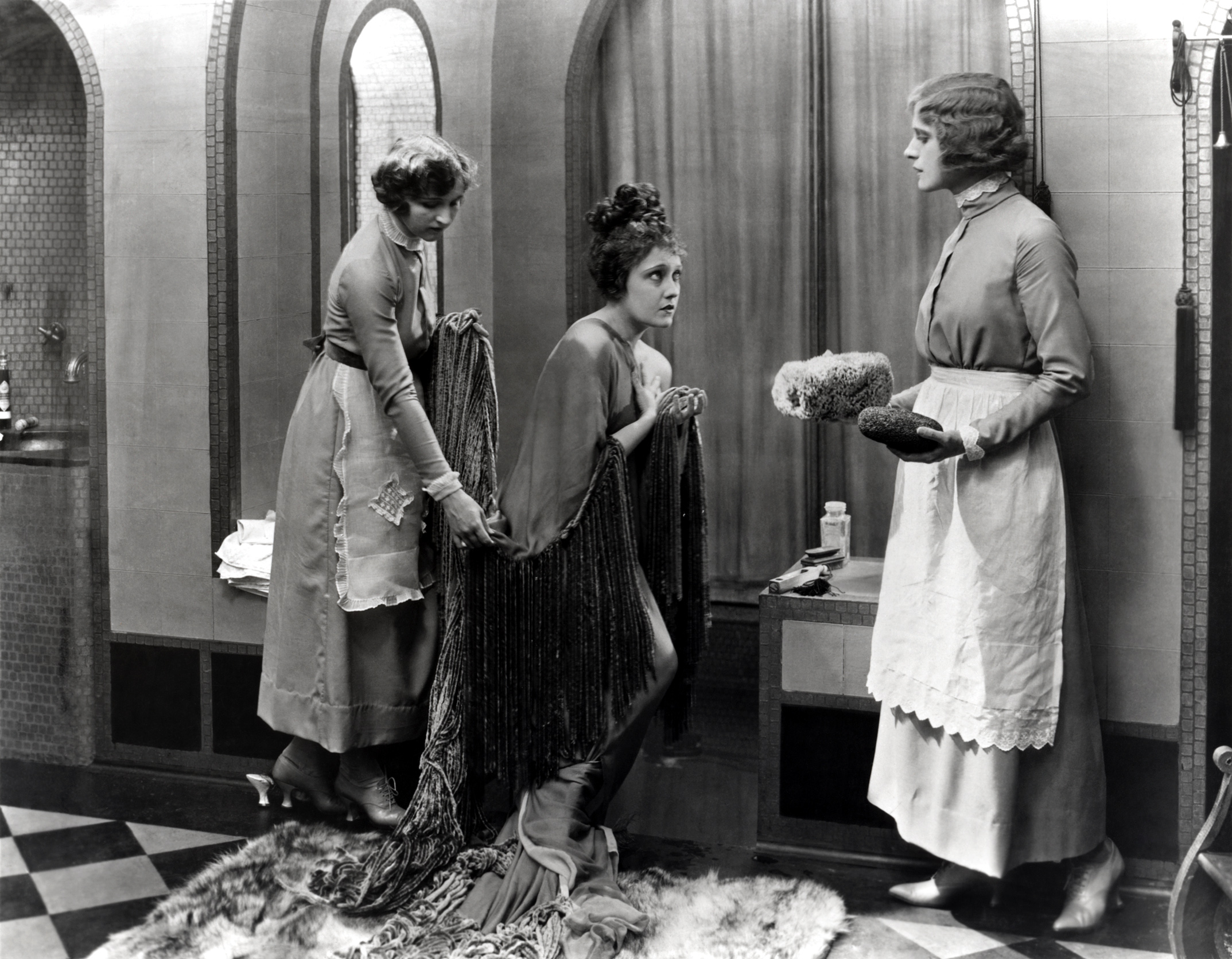 From force of habit he can’t help turning his Garden of Eden into a worldly garden of earthly delights. Lushly sensual, Male and Female is so slickly polished it’s like unadulterated material bliss. The cameraman Alvin Wycoff, assisted by a young James Wong Howe, uses his lens as though it were a velvet keyhole. Only instead of Lady Godiva, we play Peeping Tom on Swanson’s Lady Mary, in bed or, becoming increasingly intimate, following her into an ornate sunken bath that comes across like an architectural shrine to the aesthetic. This déclassé dip was such an eye-popping smash in its day that DeMille would virtually restage it, with characteristic aplomb, for The Sign of the Cross (1932), filling an ancient Roman bath with gallons of Grade A milk.