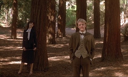 swoony elements from Hitchcock’s Vertigo. Visiting the misty Muir Woods, where they’re surrounded by old growth forests and towering redwoods that have stood for millennia, comparison is drawn between both films’ fraught themes, concerning reincarnation and how the haunted past can still blend into the present, the living intermingling with those long dead, as modern girl Amy does with H.G. Wells and Jack the Ripper. All of which make Meyer’s claim that this Hitchcock homage was unintended, quite hard to credit.