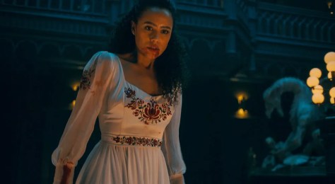 Leading lady Nathalie Emmanuel, who will be fondly remembered by many as Missandei from HBO’s Game of Thrones, is talented and appealing enough, but appears to have been cast here primarily so the camera could play off her slight resemblance to Meghan Markle. She sports a T-shirt promoting a rival network, Showtime’s long-running series Outlander, in which another liberated woman (“I like my independence.”) found herself pulled back in time into an earlier age, where her modern freethinking ways were set at odds with accepted ceremony and tradition, shocking the stockings off locals and turning society on its head. The Invitation plays into this same fundamental cottagecore fantasy that many, otherwise modern-minded, women can be found dabbling in online, finding it relaxing to project themselves into the romantic lifestyle of an earlier, and (implicitly) more stress-free time. This sort of fantasy has always been problematic for minorities though, who wouldn’t have enjoyed anywhere near the same degree of free agency as other groups of people during those periods in history. A fact that becomes patently obvious when discussion turns to Evie’s black ancestors. It also suggests the systemic sins of a historical past that remains very much with us in the present day. Rather than magically ending with the opening suicide (“It all ends here.”), the past proves prologue, as the similar, cyclical nature of Evie’s attempted escape demonstrates. Ensconced in this ancestral manor which, like its inhabitants, appears to have changed little over time, Evie struggles with her own sense of identity and proper place among her apparent people (“… a sense of family, a sense of belonging, and for the sense of purpose that comes from knowing who you are.”). Especially in light of her forebears’ disreputable reputation, which keeps being held up and thrown in her face. And when all Walt’s deferential acolytes start ‘innocently’ encouraging her to refer to him as her lord and master, such presumptuousness must seem all the more galling to her. As she incredulously observes, “Can you imagine being that rich? Just walking around like you own people?” Only to have the spot-on Grace affirm, “Girl, he probably does own people. Wanted to add you to the roster.” It’s this insufferable sense of Anglo-Saxon superiority that ruffles the feathers of black folk like Evie. These vamps consider themselves the next step up in human evolution (“I am a god!”), as outlined in the devil’s bargain Walter tries to get her to agree to: “Think about what you are gaining here. Wealth, power, great strength, life eternal. No more sickness, like your mother had. No struggle, no longer confined by the frailty of human existence. A life of privilege…. Isn’t that what you want?”