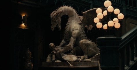 Dribbled on top of it all, there are the disembodied arms and appendages from The Conjuring and The Apparition, clapping on and off, ghostly apparitions and jump scares aplenty. Just to provide the requisite quota of starts the screenwriter’s more sedate story wasn’t properly structured for, one too many of these wrap up with the lead waking from nightmares, that prove none of what we saw was real. There are two (count ‘em) virgin sacrifice scenes, with comely maidens selected from a queued line, being sent to clean dark, dank dungeon-like parts of the house, that are staged in a rather repetitive manner, and end almost identically. And the offing of the first maid, while wearing earbuds so she can’t hear the beast approaching from behind, for some reason, directly recalls the attack on that Walkman-wearing, convenience store clerk in J.J. Abram’s Super 8. The only compelling aspect to be had from any of this is the clever way the monster we only see in fits and starts, becomes suggestive of that enormous stone dragon statue decorating the foyer. In addition, realtor Oliver Alexander (played by Hugh Skinner as the proverbial, silly English ass) seems to be positioned in the Renfield role initially, procuring victims for the master. But then to confuse the issue, we’re introduced to the butler, literally named Renfield.