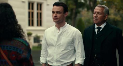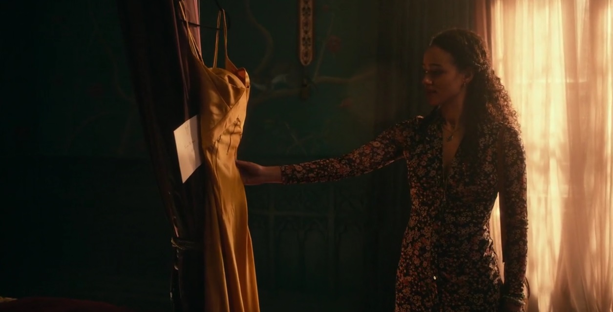 Like the waitstaff, Evie herself represents a melding of several different racial and national identities intended to make ethnic purists uncomfortable. For instance, she’s wearing a backless Beauty and the Beast gold dress gifted her by ‘Walt,’ when she makes her dramatic entrance at the reception. And with her hair styled to the side and an ornamental nose ring in place, she seems purposely done up like a Hindu bride from New Delhi, appropriating the culture to acknowledge the earlier waves of Indian immigration to Britain. To the aged aristocracy, Evie, all ‘sparkly and new,’ seems quite ‘refreshing.’ She presents the prospect of dragging these staunch traditionalists, kicking and screaming, into the 21st century, much as her character is meant to be injecting new blood, literally and figuratively, into their ancient line by presenting the prospect of becoming a breeding vessel (“With so many boys, we thought we were done for.”).