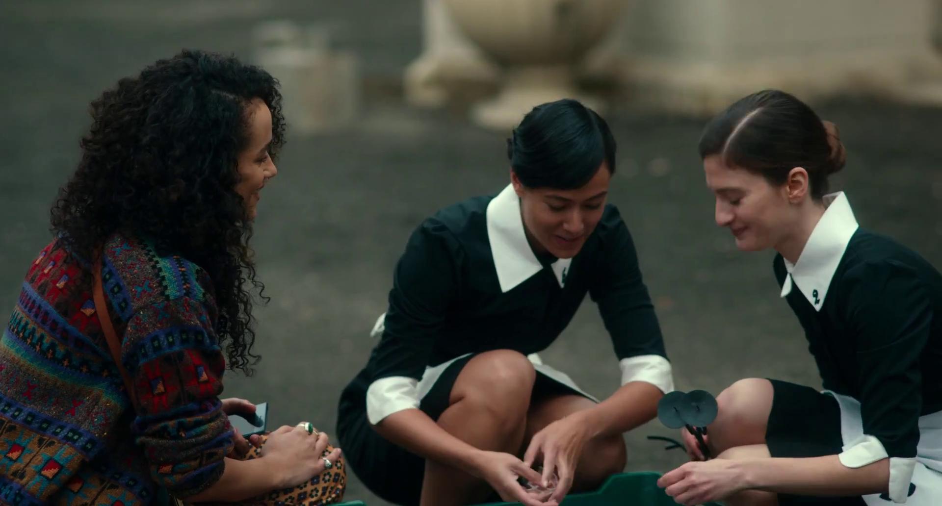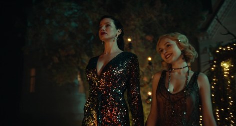 The inferiority complex this black commoner must constantly fight an uphill battle against, of essentially feeling not good enough, as if she were an unworthy transgressor among her betters, has ties that stretch back into such familiar Gothic romances as Rebecca and Jane Eyre. An Ancestry.com-like DNA kit proves her entrée into this retrofitted Cinderella fantasy (“Did your girl turn into a pumpkin?”). And it’s here where the sensitivities and sensibilities of the female director and writer, and the surprisingly strong and supportive, female-centered cast, become most apparent. The mysterious dark, brooding, master of the manor here would seem just at home signing his name as Rochester or DeWinter, instead of de ville, to the monogrammed notes he’s constantly leaving about, given all manner of horrors we find squirreled away in his attic. We sense he’s a very old soul, since this lord who appears to be Evie’s own age (“You’d think he’d be a hundred years old, but he’s our age.”) is said to despise technology. But what’s the fun of living forever if you can’t play with all the new toys? Certainly this doesn’t square with the dossier he’s had compiled from online research about Evie. He appears quite at home surfing the net, even if in this roundabout way. Yet, one must admit that he speaks sense when he says his reprehensible actions aren’t much different from the same sort of Google search we all do on people we meet, and are interested in finding out more about, by tracing their digital footprint. (“Given the opportunity, we’d all snoop. Read their diaries, texts, e-mails. Can’t help it. It’s in our nature.”). As Walter de Ville, Thomas Doherty delights in fully reveling in his wickedness. With his dopey smile, he seems to be having the time of his life being bad. The spot-on references to him as a son of the devil may explain the whispered incantations that appear to accompany the first two kills, like satanic verses (is it Romanian?). As the movie tries to gaslight us, much as Walt does Evie, we ponder whether we’re imagining things, or if his ears really are shifting into pointy edges, as he delivers his angsty monologues. He ends up revealing talons that need manicured far more than Evie’s nails