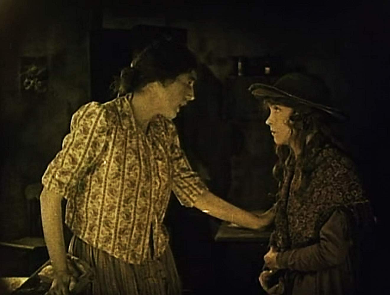 Gish’s semblance of a sickly demeanor was not all acting, since the actress contracted Spanish flu soon after rehearsals began for the movie, with Griffith insisting, according to Kevin Brownlow in Behind the Mask of Innocence “that (she) wear a (surgical) face mask whenever possible.” She was so weak and miserable during filming that the classic gesture, where her character unhappily simulates the contours of a smile by pushing up the corners of her mouth, was improvised on the spot. Determined to turn her frown upside down and soldier on, this inspired bit, one of the hallmark moments of Gish’s career, so impressed Griffith that he went back and sprinkled it throughout the entire film as a recurring motif. This effort to put on a happy face would became an iconic silent touchstone, one so enduring that Chaplin himself