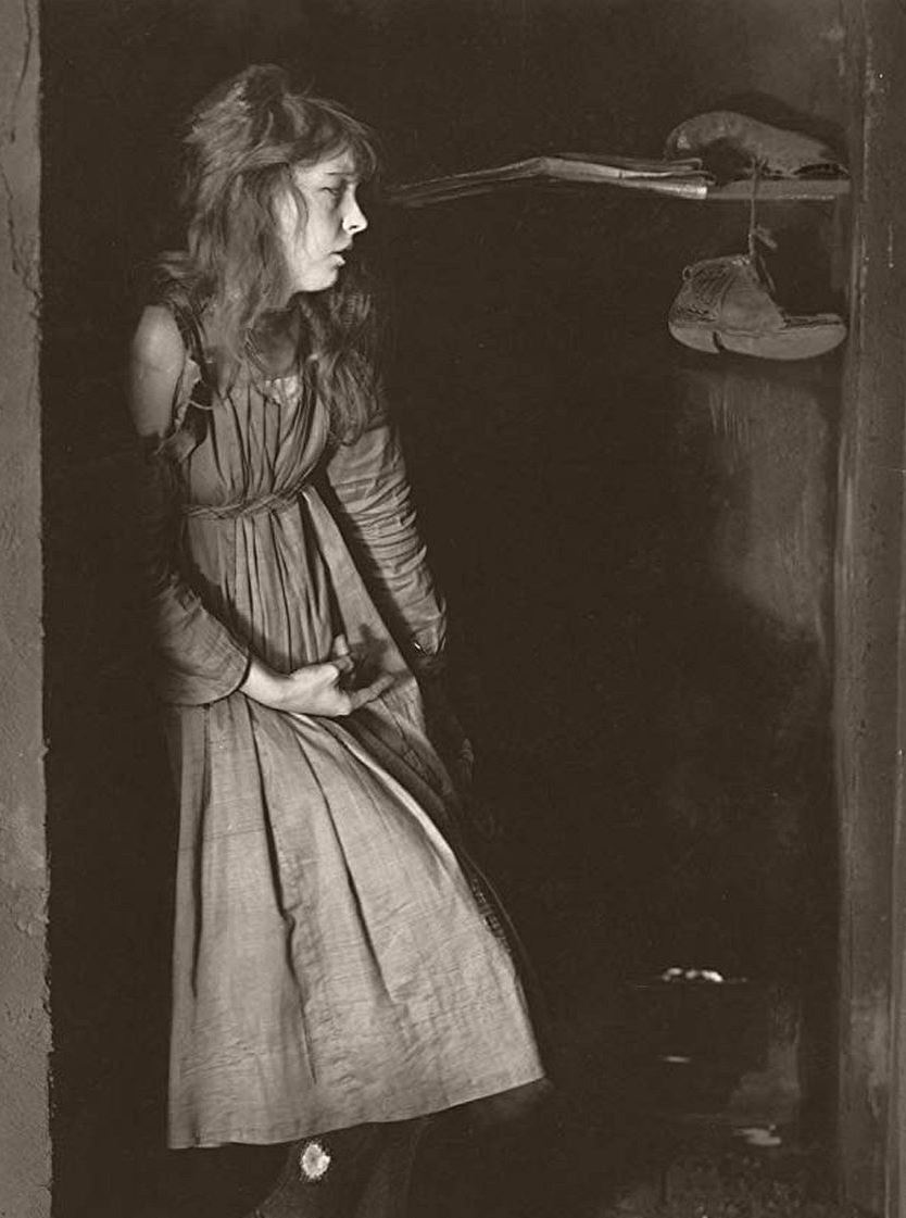 Of the many persecuted innocents Lillian Gish portrayed for Griffith, little Lucy Burrows was her most pitiable. Conceived in a spirit of pure pathos, touched off by an ethereal spark of genius wholly unique to the actress, Gish appears to have been influenced in equal parts by Mary Pickford’s unfortunate Cockney slavey, from the previous year’s Stella Maris, and, oddly enough, Charlie Chaplin’s Little Tramp. Not coincidentally, inspiration for Chaplin’s beloved character had grown out of the comedian’s own poverty-stricken, Dickensian childhood in a turn-of-the-century London markedly similar to the one depicted in Broken Blossoms.