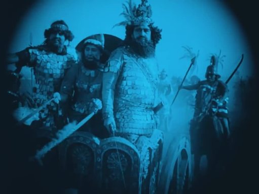 In her review of the film, occasioned upon the death of star Mae Marsh, critic Pauline Kael claimed “a history of Russian movies could be based on the ice breaking up in Griffith’s Way Down East.” Well, a similar cinema primer could be written about the storming of the great Babylonian gate here, one of the most famous sets in screen history. Griffith constructed it so sturdily that two chariots can pass abreast of one another atop its ramparts. And when the heralds sound their clarion call to arms, we’re put in mind of the shofar horn blown to bring down the walls of Jericho. The barbarians at these gates will similarly attempt to batter down the walls of Babylon, pulling down about their ears these pillars of the earth, supported by rearing pachyderms who take the same stance as Atlas.