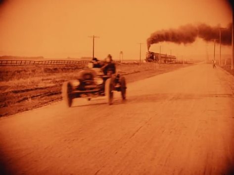 Though he would soon be accused of being out of touch, Griffith had his finger firmly on the accelerating pulse of the public at the time. As related in the PBS American Masters series D.W. Griffith: Father of Film, his races to the rescue, with their headlong forward momentum, intuitively tapped in to America’s growing romance with speed, a very contemporary, 20th century phenomenon impelled by the advent of so many new means of modern transport – planes, trains, automobiles, making travel faster, easier and more economical, increasing the pace at which the world seemed to be spinning at the dawn of the Machine Age. Intolerance’s inception of that contemporary race between car and train in the modern story for instance, proves every bit as iconographic as John Henry’s race with that steam powered hammer in American lore. When a shot flashes onto the screen of the steel locomotive relentlessly chugging across the landscape while a horse-drawn wagon pokes along in the opposite direction, the contrast between past and present, old-fashioned horsepower giving way to four-cylinder horse power is brilliantly encapsulated.