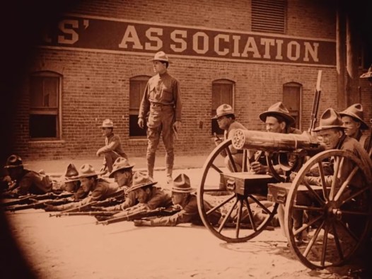 Other memorable interludes include the millworkers of the modern story marching like dehumanized drones through factory gates that now resemble prison bars, their lockstep movements akin to the human cogs that become extensions of their machines in Metropolis. And after The Boy’s father is mowed down by militia called in to machine gun strikers, a shocking episode inspired by an actual incident at the Rockefeller owned Ludlow mine, Bobby Harron again becomes the young soldier embracing his fallen friend on the field of battle in The Birth of a Nation.
