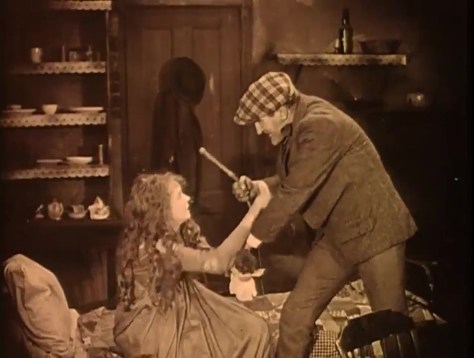 than life sense of menace. Burrows isn’t meant to be scaled down to realistic dimension, but a loutish figure out of florid Victorian literature, a grotesque of the most Dickensian kind. If Crisp had tried to play this part with subtlety, rather than barreling his way through the low hanging fog banks of London like Jack the Ripper, he wouldn’t have been nearly as effective or terrifying. His overbearing behavior must overwhelm and pummel the viewer into submission, same way he does his daughter, leaving audiences punch drunk so they can more strongly identify with her. When Battling chops down the door of the closet where a cornered Lucy’s taken refuge, smashing through, he might be some hair-raising figure in a horror film, Jack Nicholson in The Shining maybe, or the more contemporary Axe Man of New Orleans. If anything, audiences of the time must have been put in mind of George Siegmann’s sadistic Hun soldier from Griffith’s recent Hearts of the World, who similarly battered down a door at the end of that film, in his own determination to get at Gish.