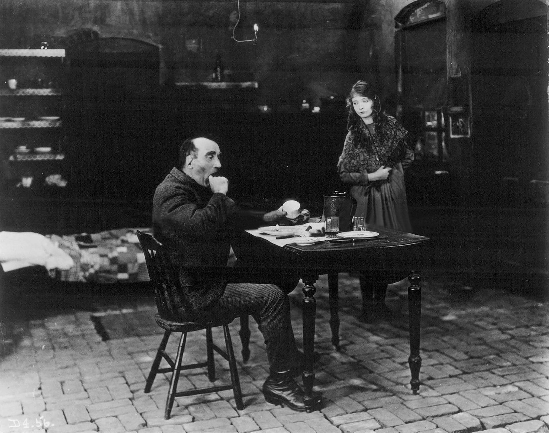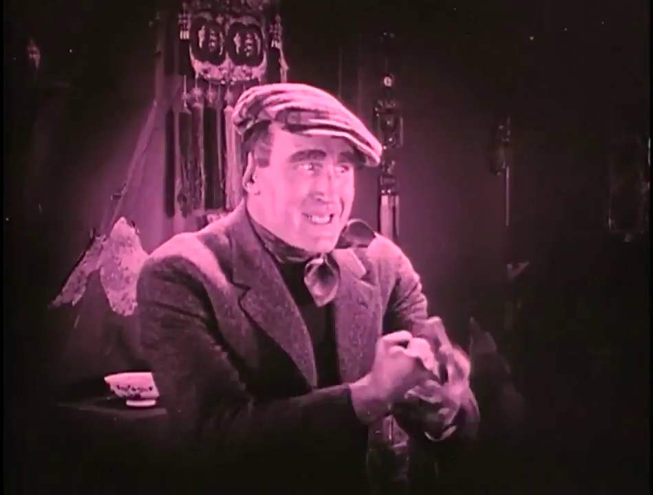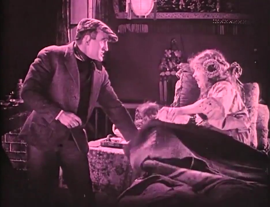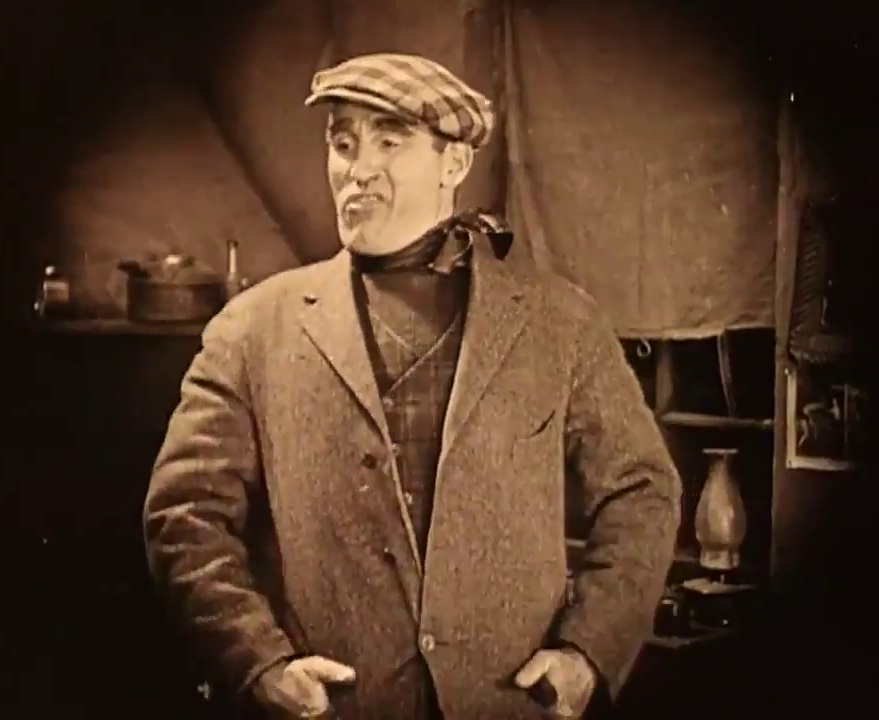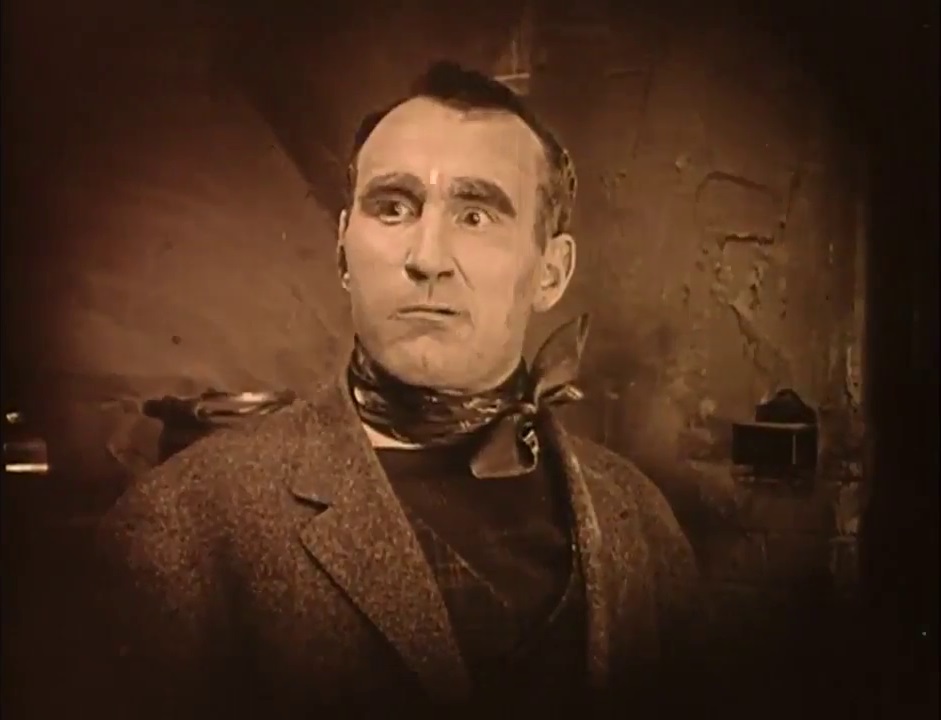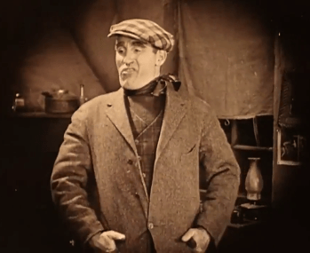 Occasionally Crisp suggests a mugging, self-satisfied Mussolini in the role, smugly subsisting in a world where might makes right. Pugnaciously striking his pugilistic poses, he swaggers about with his chest puffed out like a pewter pigeon, and thrusts forward his torso on tottering legs, in a way that anticipates later caricatures of James Cagney gangsters. In his checkered hat, kerchief, and sweater, he could easily be mistaken for one of Griffith’s Bowery toughs from his short The Musketeers of Pig Alley. Especially when he looms into an extreme closeup upon finding Lucy in Huan’s bed, recalling Griffith’s innovative use of such shots in that earlier film. However, as Kevin Brownlow points out in Behind the Mask of Innocence, it was the part of “Bull” MGee that Crisp had played in 1914’s lost The Escape, one of Griffith’s initial features, that had been the real dress rehearsal for his Battling Burrows.