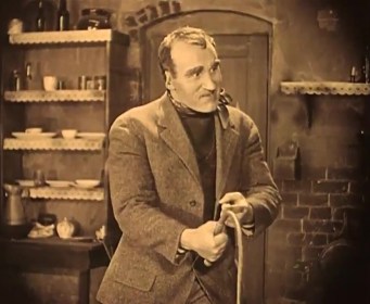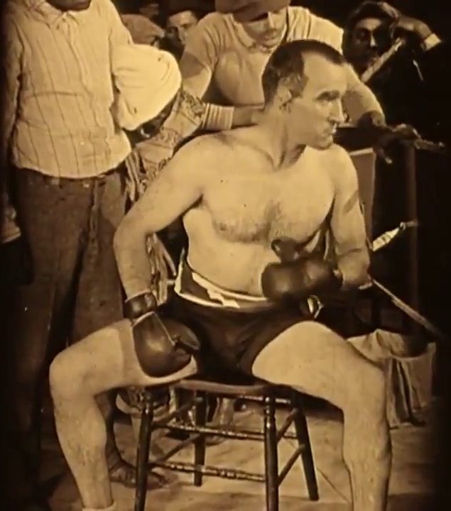To enhance this impression, Crisp sports curling tufts of receding hair on the tops and sides, a cauliflower ear curled over from too much pummeling, eyebrows made heavier to give him a more pronounced, jutting brow, all while carrying himself with long arms he swings like a lowland ape. When he sits in his neutral corner of the boxing ring, his silhouette is suggestive of an old silverback, with his biceps and back inflated like bellows. He even wolfs down his food as if he were an animal, freely licking his plate and picking his teeth, foreshadowing Frederic March’s monkey-like Mr. Hyde, who would similarly feed his voracious animal appetites. This kind of coarse throwback having died out in mankind’s evolutionary past, the point the movie makes is that the unacceptable bent toward violence ‘Battling’ embodies has no place in our supposedly civilized, modern society.
