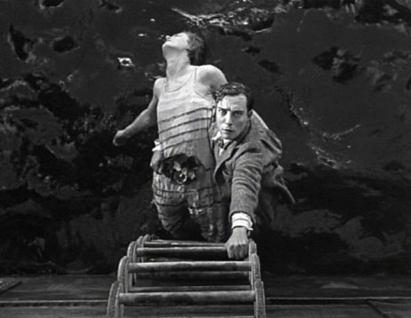 Buster’s specialty however, remains the humor derived from his interactions not with people, but with gadgets. Anticipating a similar sequence with a real cannon in The General, a toy canon gets tethered to his foot, tailing him despite his desperate attempts to escape its sights. The actor puts ordinary objects to incredibly creative use. Repairing the hull, for instance, he enlists a handy lobster to serve as a pair of pliers, and then commandeers a nosy swordfish to fend off its combative companion in an undersea duel straight out of Jules Verne. Early on, when his Rollo tried preparing the first meal he ever had for himself, the resulting mess was a hilarious fiasco. By movie’s end however, in an echo of the earlier scene, he’s rigged up an ingenious assortment of automated, timesaving contraptions, recalling those Keaton had contrived for his short The Electric House, out of commonplace household objects, which allow him to breeze through the morning routine. It’s the movie’s most arresting sequence because it allows the comedian to display the dazzling degree of self-sufficiency his